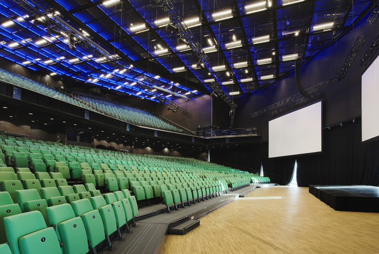 Despite the restricting triangular site, all this was achieved by subdividing the project into three properties. The elevated congress hall corbels out over the entrance plaza, becoming much larger than its own footprint on the ground.