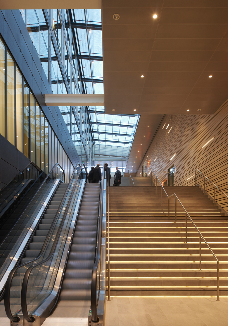 The Stockholm Waterfront boasts many green credentials. Heat is generated via the glass façades, which act like huge solar collectors. Conversely, water from the nearby lake Klara Sjö cools the building, and is stored in the 250 tonne basement ice store. A complex control system transfers energy around the building, attending to both energy surpluses and deficits.