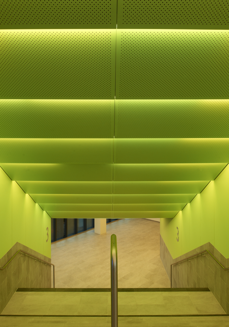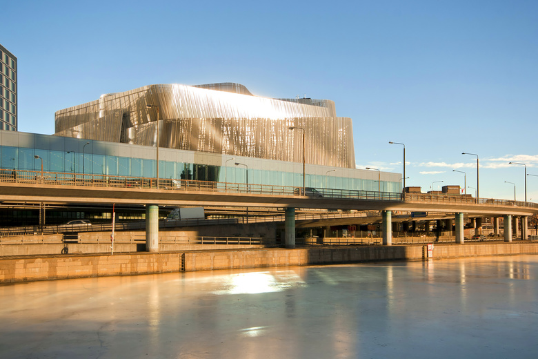 Externally, the elevated congress centre provides the main focal point, featuring an external shell enclosed by ‘veils’ constructed from 3500 z-profiles in stainless steel. Free flowing contours interplay with the movement in both the surrounding flyovers and the horizontal lines of the quays. The structure is fully prepared for illumination, further enhancing the centre’s distinct character.