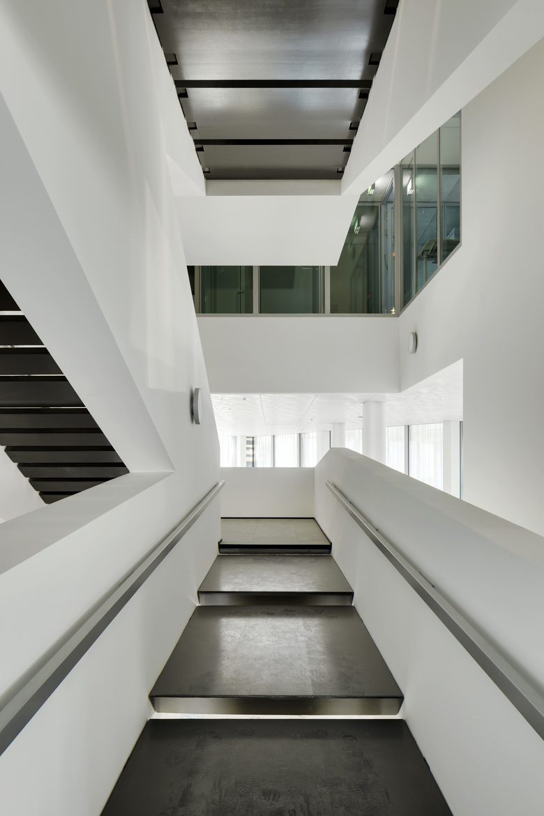 The entire lobby and ground floor are publicly accessible, ensuring a continuous animation throughout both, which compliments the adjacent public square. A central staircase rises from the lobby up and into the 20-story tower, allowing employees to, if desired, meander throughout all levels of the office without entering its core. A café and restaurant are located on the fifth floor, rather than within the lobby, which creates a buffer zone between public and non-public areas. A ‘business center’ is located one floor below, and contains meeting rooms for use with external clients. This ‘business center’ enables employees to meet with their guests, without the need for elevators.