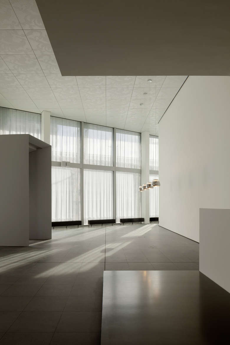 Interior heating and cooling occurs through a paneled ceiling system that utilizes concrete core activation and concealed air ventilation. These 1.35 x 1.35 m panels are composed of ‘crumpled’ steel sheets into which a three-dimensional pattern, derived from traditional ornamentation of Swiss chalet eave, has been stamped, which introduces a larger scale to the interior office spaces by decreasing the amount of visible ceiling seams. Micro-perforations in the panels maintain ventilation, allowing for no visible interior air ducts and the placement of an acoustically absorbing sheet on the back of each.