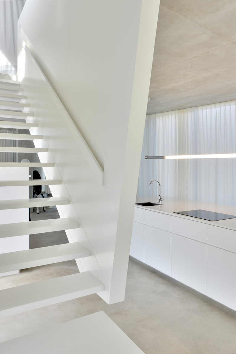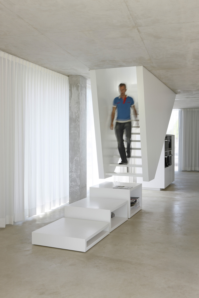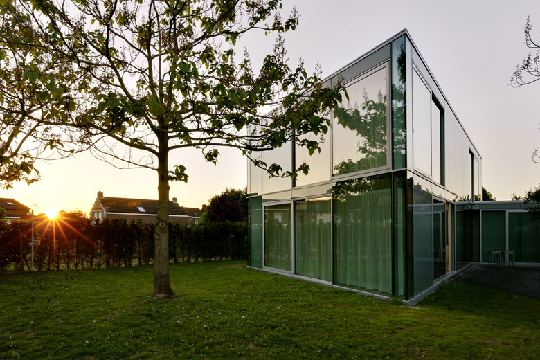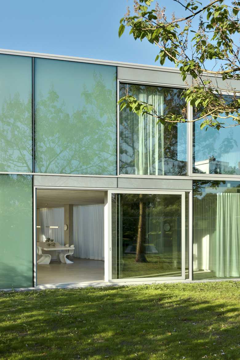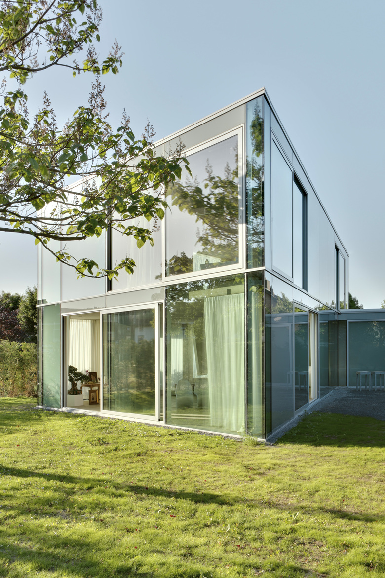 This house is situated in suburban Maastricht, just south of the city's center. It was designed for a couple—a dancer and an actor, who are also landscape architects—and is located within an existing formal garden that the owners had cultivated over the years. Composed of two concrete floor slabs wrapped in an all glass skin that varies in shades of opacity–from transparent to opaque–the interior is organized so that it assumes the characteristics of a single, open, loft-like space. The two exceptions to this completely open living situation are the contiguous volume of the upper story bathroom, which cantilevers over the terrace entry off the kitchen below, and that of the front entry, which projects from the main volume to create a roof terrace. The house's staircase is suspended from the first level so that it does not touch the ground floor; its lower portion is composed of movable units that also function as storage for the ground floor kitchen and living space. Small rectangular columns support the house's concrete slabs. The owners are able to reconfigure their interior spaces, due to the numerous curtains–whose tracks are recessed within the floor slabs–and the lower components of the staircase; ephemerally defining rooms reflective of the seasonal changes within the surrounding formal garden.