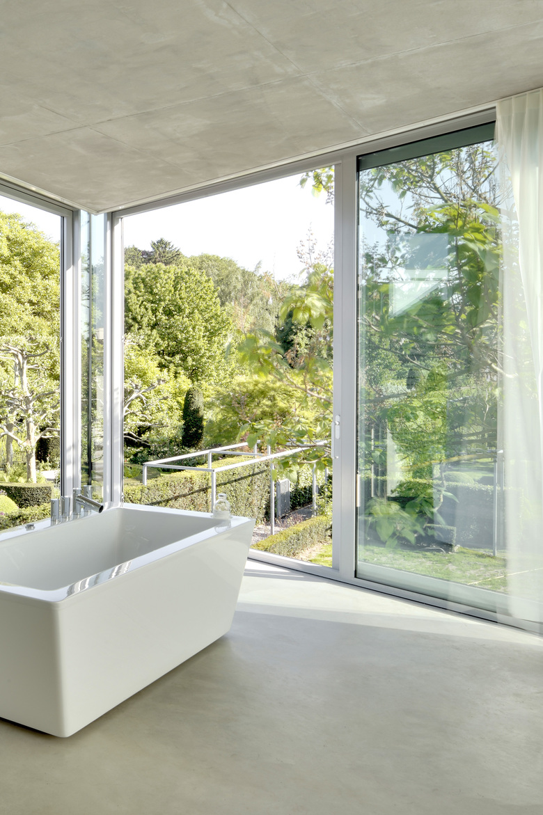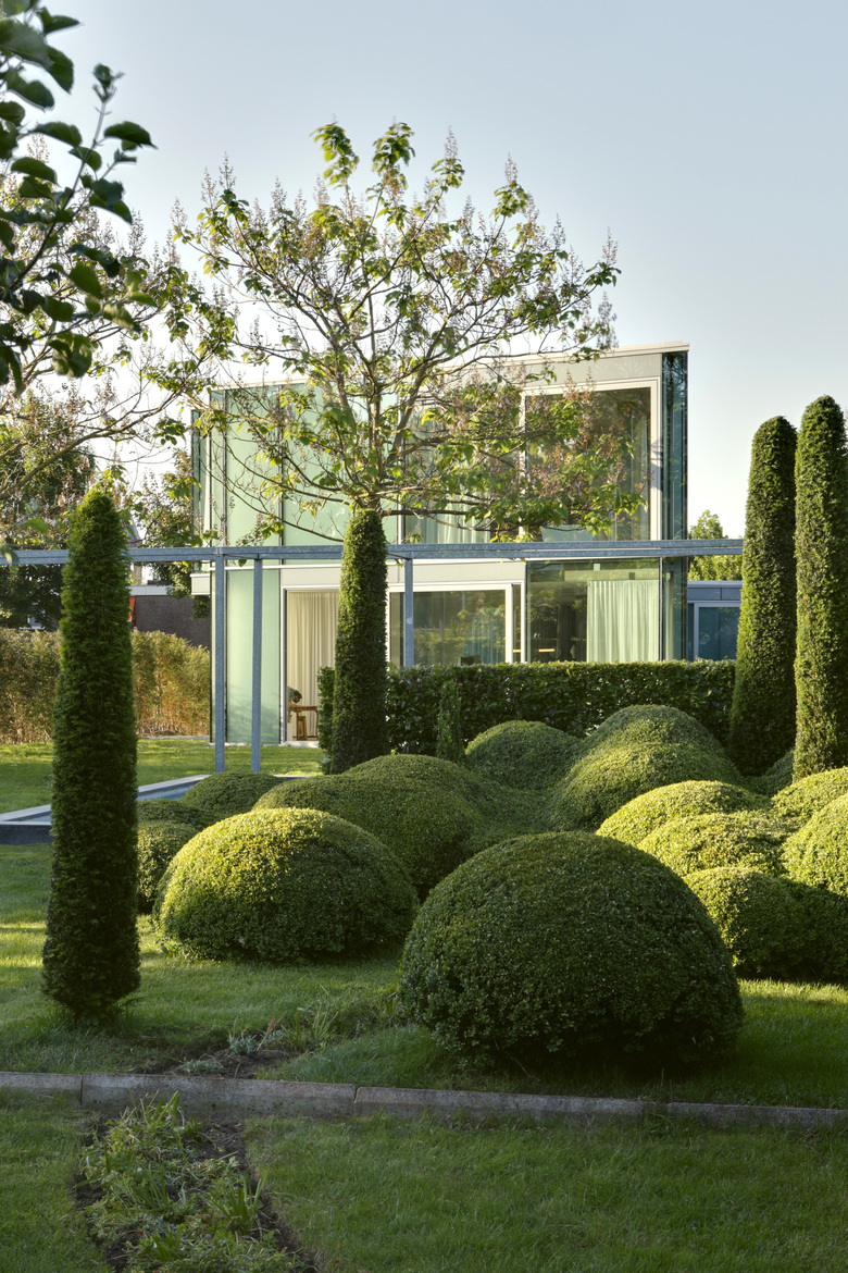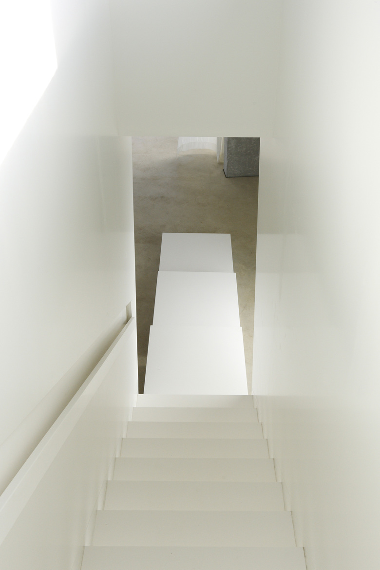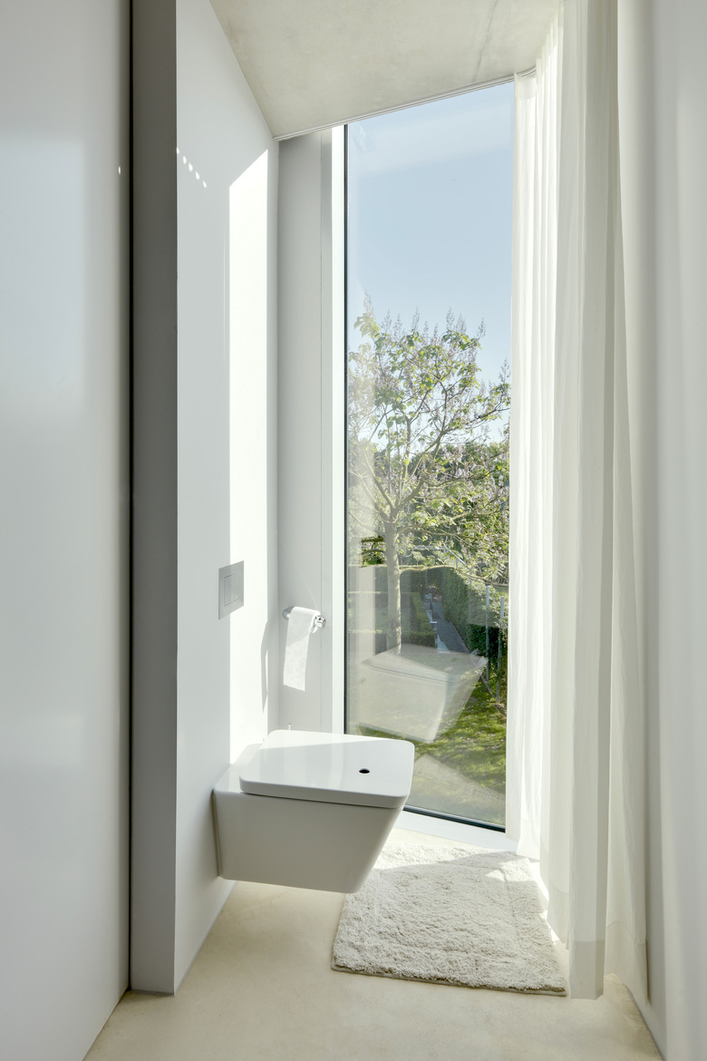 This house is situated in suburban Maastricht, just south of the city's center. It was designed for a couple—a dancer and an actor, who are also landscape architects—and is located within an existing formal garden that the owners had cultivated over the years. Composed of two concrete floor slabs wrapped in an all glass skin that varies in shades of opacity–from transparent to opaque–the interior is organized so that it assumes the characteristics of a single, open, loft-like space. The two exceptions to this completely open living situation are the contiguous volume of the upper story bathroom, which cantilevers over the terrace entry off the kitchen below, and that of the front entry, which projects from the main volume to create a roof terrace. The house's staircase is suspended from the first level so that it does not touch the ground floor; its lower portion is composed of movable units that also function as storage for the ground floor kitchen and living space. Small rectangular columns support the house's concrete slabs. The owners are able to reconfigure their interior spaces, due to the numerous curtains–whose tracks are recessed within the floor slabs–and the lower components of the staircase; ephemerally defining rooms reflective of the seasonal changes within the surrounding formal garden.