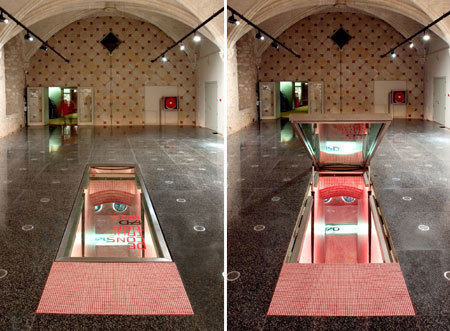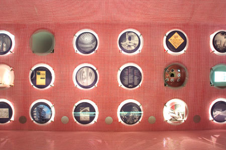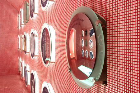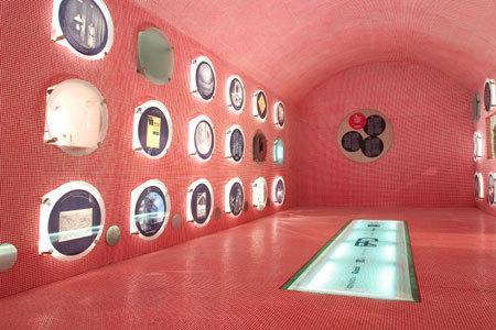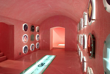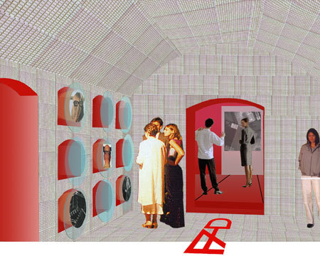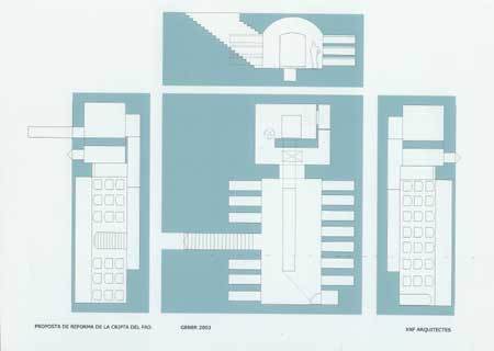 Safeguarding the memory and the capacity of self-criticism are qualities which are unusual but at the same time basic for any centenary institution that has an unavoidable need for constant renewal. The project sets up a temporary exhibition gallery in the existing crypt in the subsoil of the FAD through a continuous coating of white ceramic "gresite" with red edges. The new heart of the FAD is completed with a series of circular glasses that blur the wholes of the niches as they convert them into showcases.