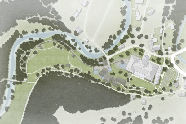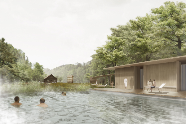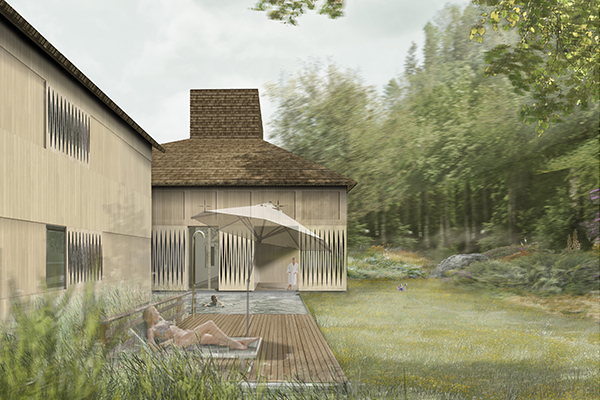 Das Konzept nutzt das gesamte Grundstück für die neue Wellnessanlage. Die unterschiedlichen Funktionen finden im Freiraum und in atmosphärischen Häusern, die zu beschaulichen Rückzugsorten werden, ihren Platz. „Gartenhäuser“ als Inbegriff des Refugiums: „Life in the Woods“. Landschaft und Häuser verbinden sich zur neuen Spa – Anlage.