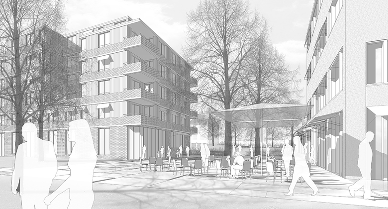 Am Fuss des prägnanten Freiraums Rehbühl bilden das Schulhaus der BWS und das Wohnhaus der Genossenschaft mit ihren gemeinschaftlich genutzten Einrichtungen den neuen Quartiertreffpunkt – den Platz am Rehbühl. Dieser neue Platz ist der Mittelpunkt aller Aktivitäten, hier kreuzen sich alle Wege, hier treffen sich zwanglos Jung und Alt, hier bietet sich attraktiver Aufenthalt für das ganze Quartier: Der Platz wird zum Zentrum.