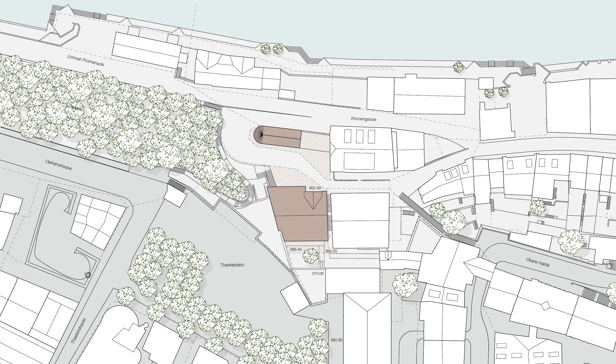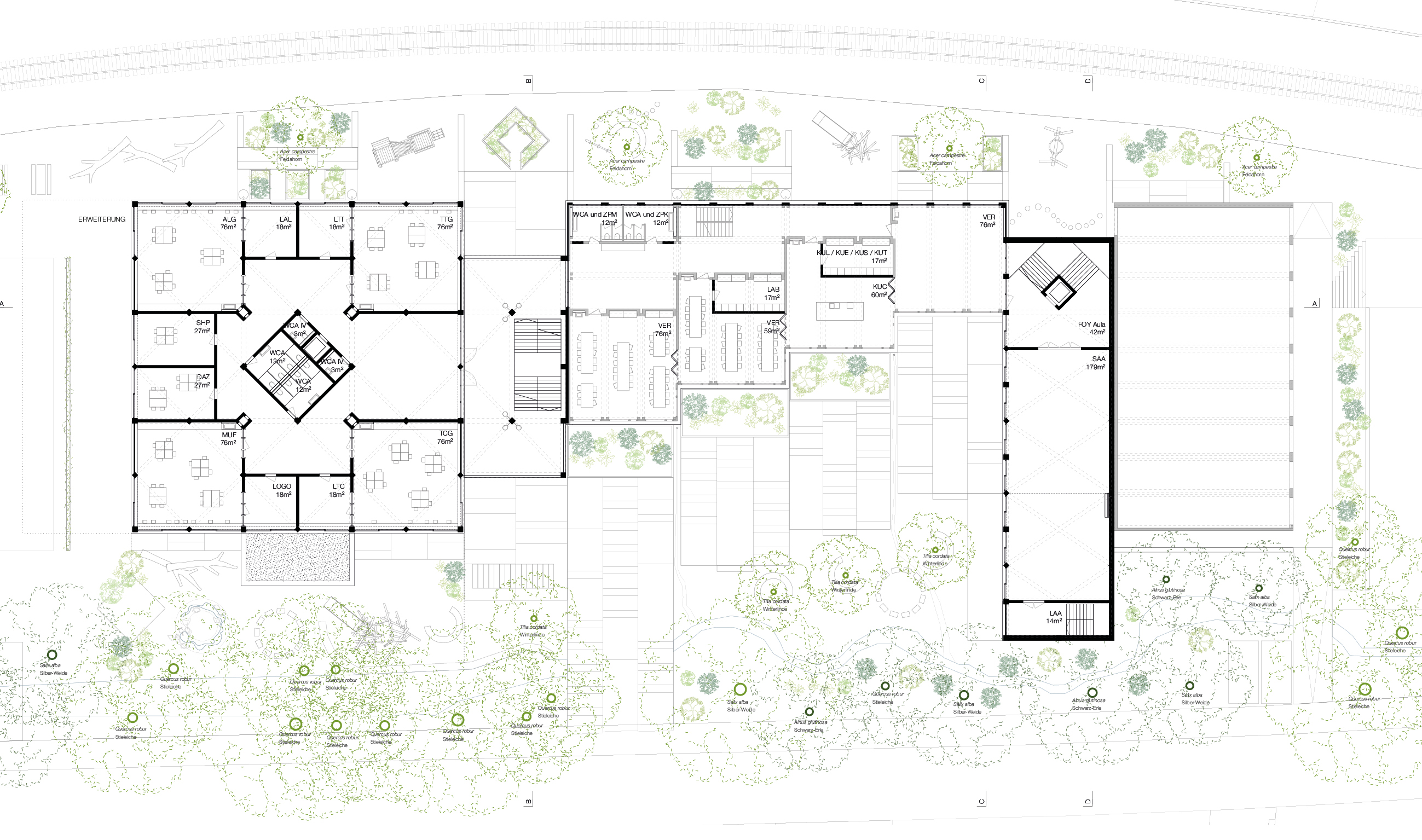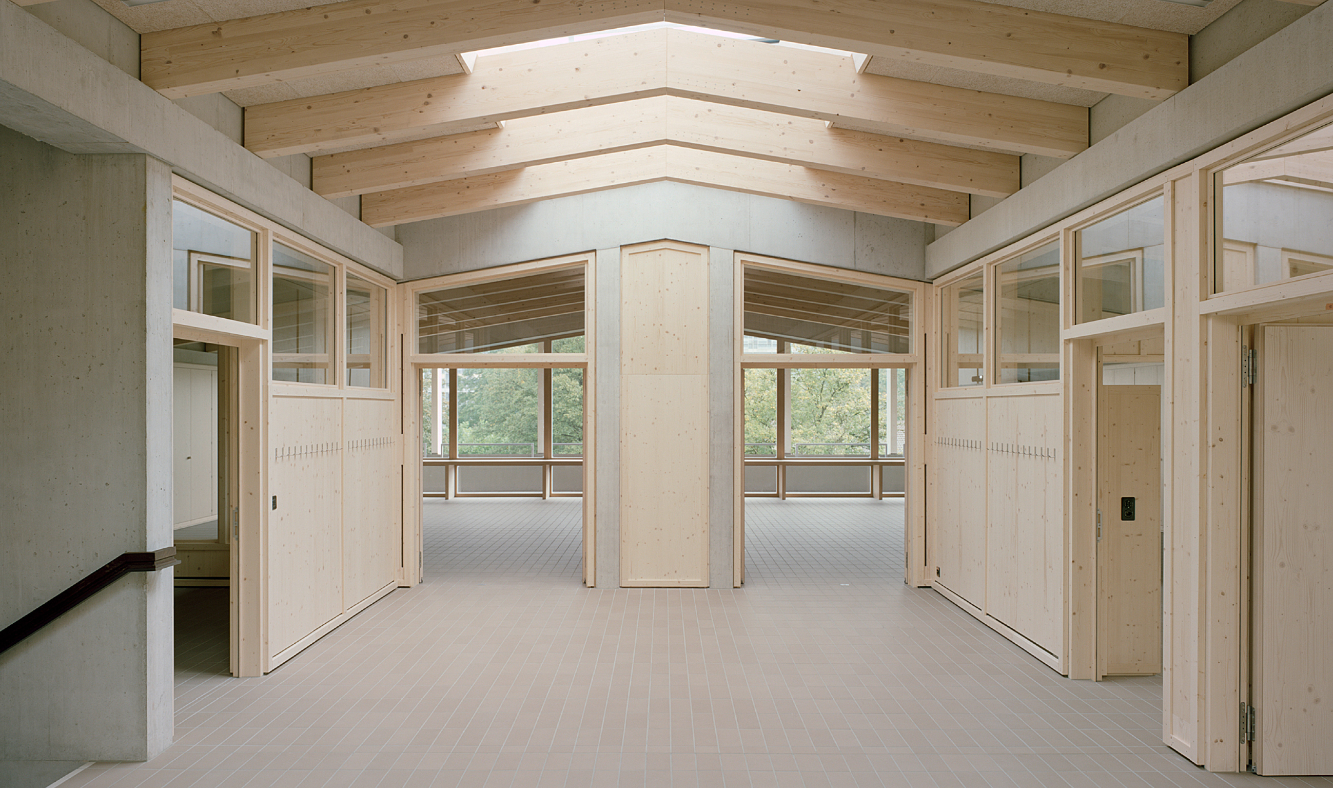 Der viergeschossige Holzbau ergänzt das Ensemble zwischen Kapelle und Schneblibau, wahrt den Baumbestand und stärkt mit klarer Setzung und einem aktivierten Freiraum die räumliche Vernetzung im Quartier. Das alte Schulhaus wird zu einem Gartenpavillon rückgebaut und als Treffpunkt für das Quartier umgenutzt. Durch «Design for Disassembly», Re-Use von Bauteilen, Low-Tech-Klimaansatz und flexible, offene Grundrisse entsteht ein zukunftsfähiges Schulareal.