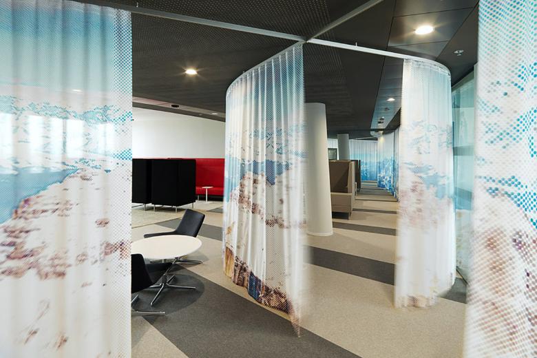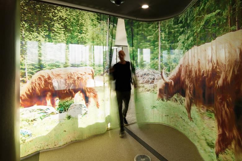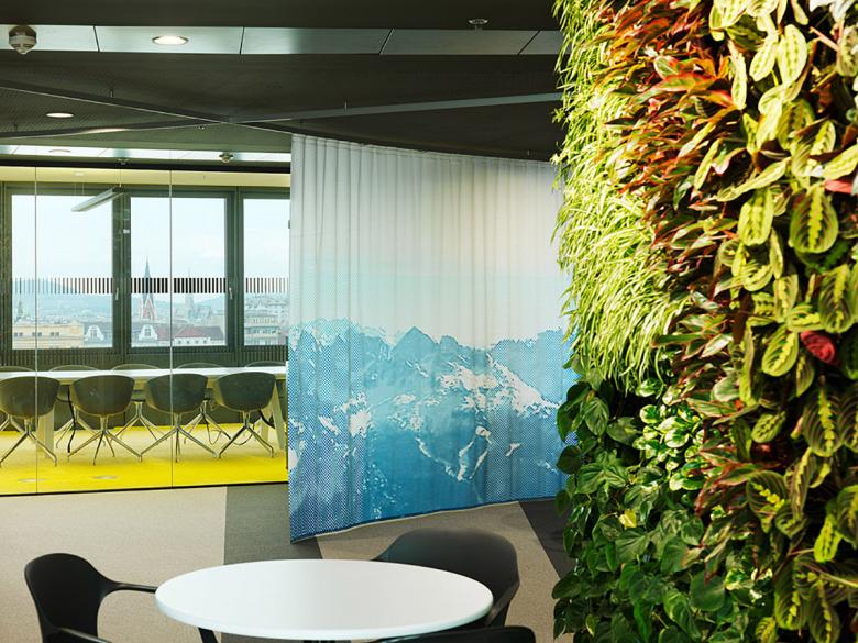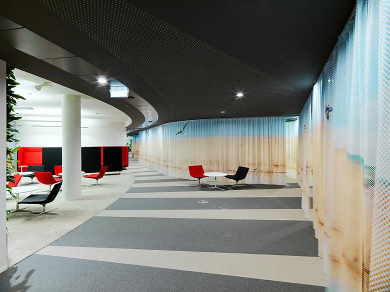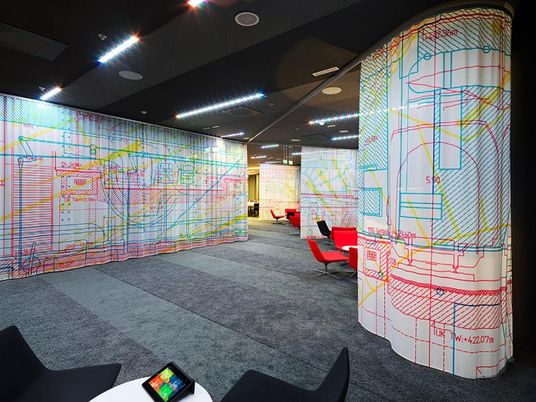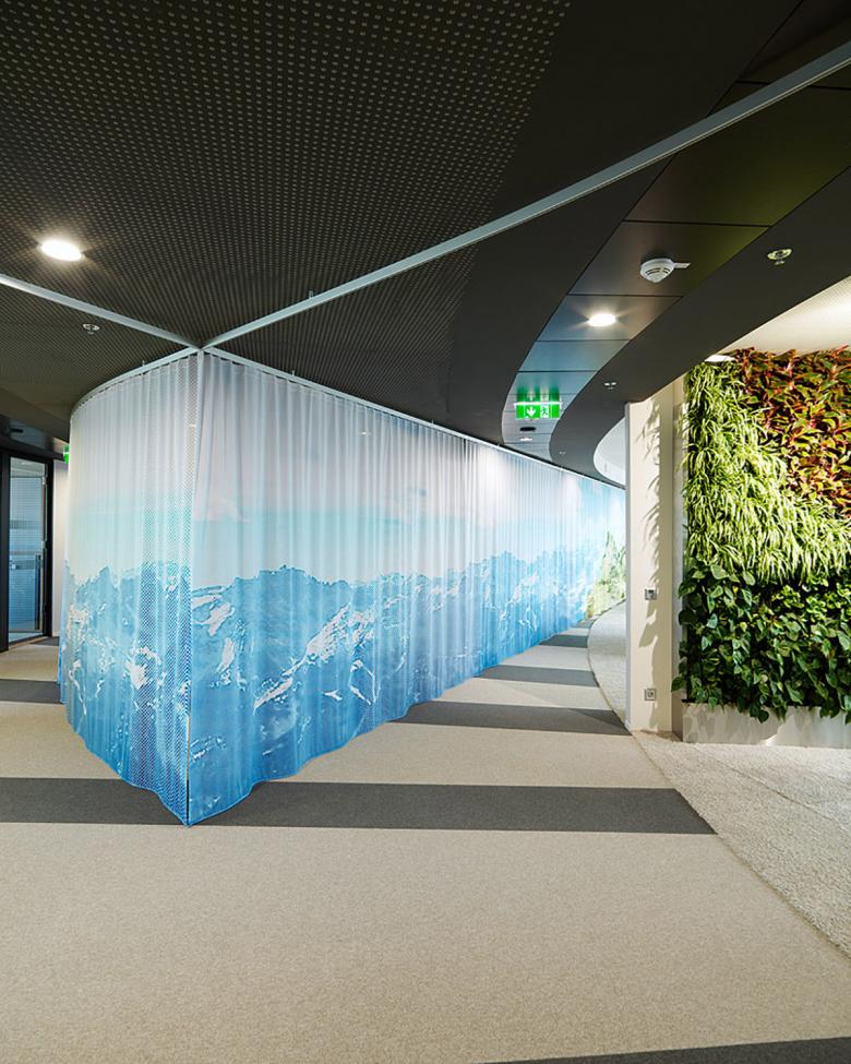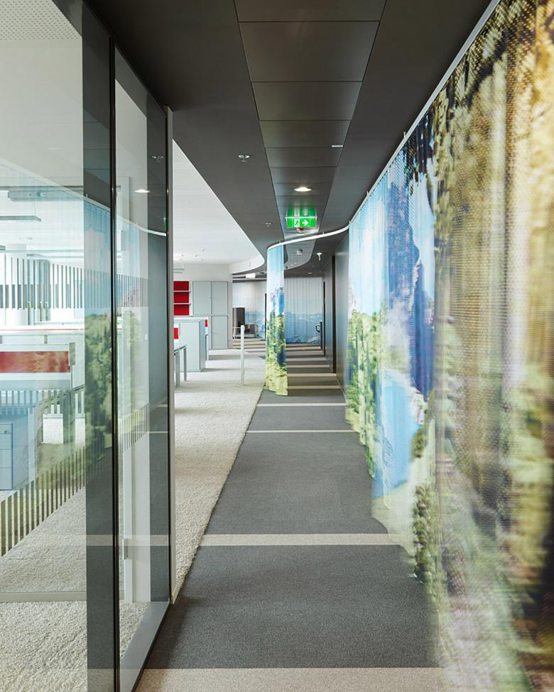 Herzstück des Designs ist ein 3,6 km langer, alle 23 Geschoße überspannender, beweglicher Screen, der eine Reise durch Österreich darstellt und sowohl zonierende, atmosphärische als auch akustische Qualitäten aufweist.