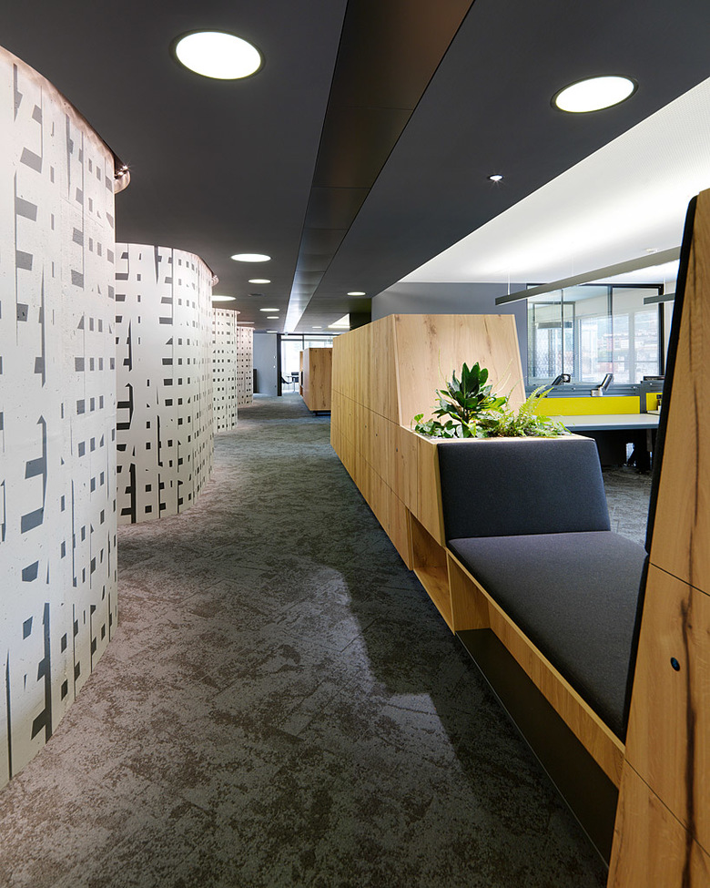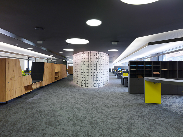 Besprechungs- und Rückzugsräume, Telefonboxen und Sitznischen zonieren den Großraum und schaffen so eine Abfolge von halb offenen Gruppenbüros.