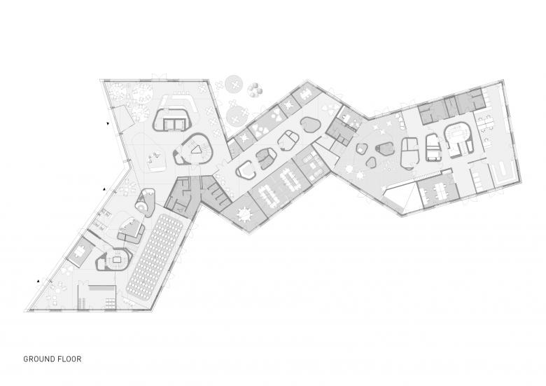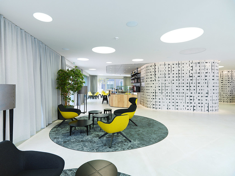 Das Erdgeschoss ist ganz Kommunikationsort, sowohl nach innen als auch nach außen: Unterschiedliche Besprechungs- und Konferenzräume bilden eine Einheit mit der Bankfiliale und dem Café und ermöglichen mannigfaltige Formen der Begegnung mit dem Kunden, die Kinderkrippe ist zeitgemäßes Signal eines attraktiven Arbeitgebers an seine Mitarbeiter.