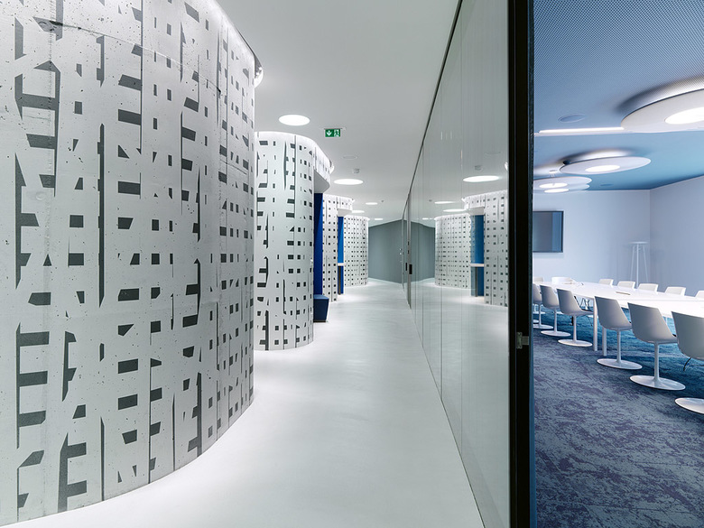 Zum anderen die zentralen „Kerne“, die von der Künstlerin Esther Stocker mit Wall Works „getarnt“ eine durchgängige 4-geschossige Raumskulptur bilden und als zweites Element stark identitätsstiftend sind.