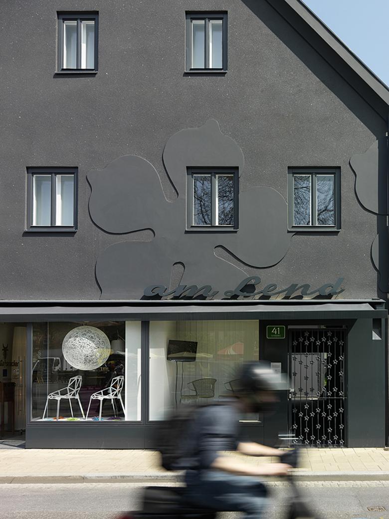 Ein zentrales Element, die Rose, verweist formal auf die Bauzeit des alten Teils, aber auch auf die Statue der heiligen Rosalie auf dem angrenzenden Platz. Dieses Motiv zieht sich durch das gesamte Design, in maßgefertigten schmiedeeisernen Blumen an den Geländern und als Ergänzung zu großen Rosenreliefs an der Fassade. Die „Rose am Lend“, ein viergeschossiges Gebäude bestehend aus elf Wohneinheiten und Gewerbeflächen im Erdgeschoss, schafft eine starke und unverwechselbare Identität.