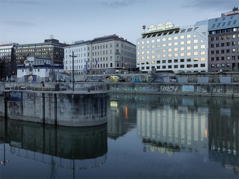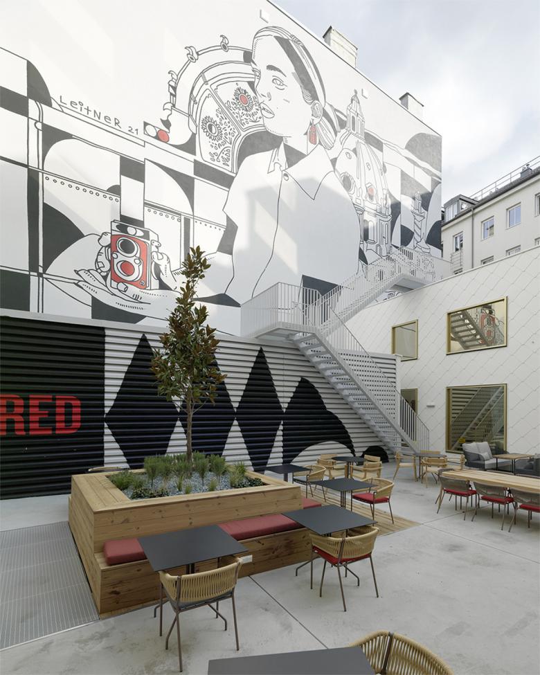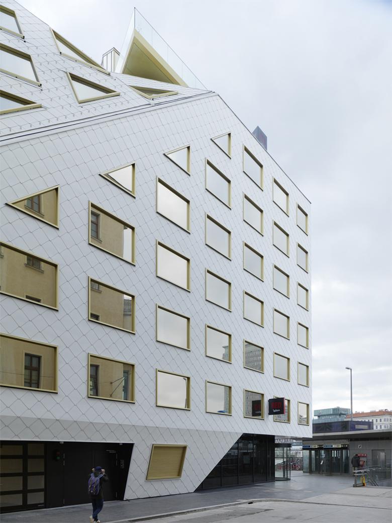 Das Grundstück in prominenter Lage am Donaukanal mit Blick auf die Sehenswürdigkeiten der Wiener Altstadt erforderte besondere gestalterische Sorgfalt. Das skulpturale, monolithisch architektonische Konzept, das die historische Blockrandbebauung weiterführt, ist mit seiner charakteristischen Form identitätsstiftend. Die Architektur lebt von der Spannung zwischen dem regelmäßigen Fensterraster und der tektonischen Faltung der Fassade. Diese ist aus den Anforderungen der Bauordnung generiert und fördert die visuelle Interaktion des Gebäudes mit der Umgebung. Dieses Zusammenspiel wird durch die fast physische Verbindung mit der U-Bahnstation Schottenring, deren Eingang direkt vor dem Hotel ist, nochmals unterstrichen. Das transparente Erdgeschoss gewährt, von der Straße aus, Einblicke in die Lobby sowie in den Innenhof und unterstreicht zusätzlich die öffentliche Natur und die soziale Intention des Gebäudes. Dieses Konzept wird vom Innenhof bis hinauf zur Dachterrasse und dessen angrenzenden Garten weitergeführt. Ein 24 Meter hohe Graffiti im Innenhof fungiert als visueller Anker und überträgt die Urbanität der Nachbarschaft ins Innere. Die örtliche Kontextualisierung wird durch die Oberflächen und Materialien weiter kultiviert und verbindet diese mit der Radisson Design-Guideline und den von der Hotelgruppe kuratierten Möbelauswahl.