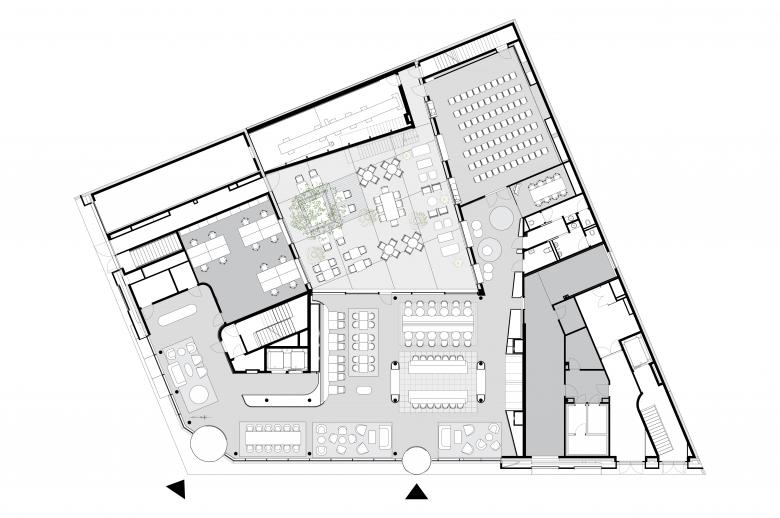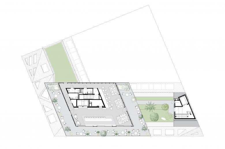 Drei miteinander verbundene Glashäuser auf der öffentlich zugänglichen Dachterrasse, die auf einer spiegelnden, entmaterialisierten Platte über dem Gebäude schweben, vermitteln durch die entstehende differenzierte Höhenentwicklung des Gebäudes zwischen den unterschiedlichen Gebäudehöhen der direkt angrenzenden Nachbargebäude. Gleichzeitig kontrastiert die Glashaus-Typologie mit dem darunterliegenden großen Gebäudevolumen und tritt in Dialog mit den umliegenden Straßen und dem vorbeifließenden Donaukanal.