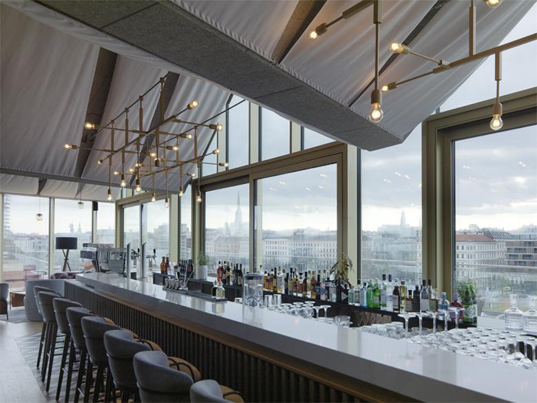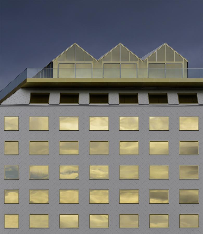 Diese architektonische Haltung überträgt sich auch in die Gestaltung des Dachgeschosseses, wo sich eine leichte, schwebende Textildecke sich zeltartig über der Skybar aufspannt und dadurch die Grenzen zwischen Innen und Außen verwischt. Die rautenförmige Aluminium-Fassadenverkleidung, die das Gebäude nahtlos überzieht, vereint Wand und Dach zu einem homogenen Volumen, das die uniforme, gesteinsartige Anmutung akzentuiert. Die präzise Faltung der Metallfassade über die vertikalen Gebäudekanten trägt wesentlich zum Gesamteindruck des Gebäudes bei und unterstreicht das Gestaltungskonzept.