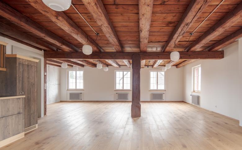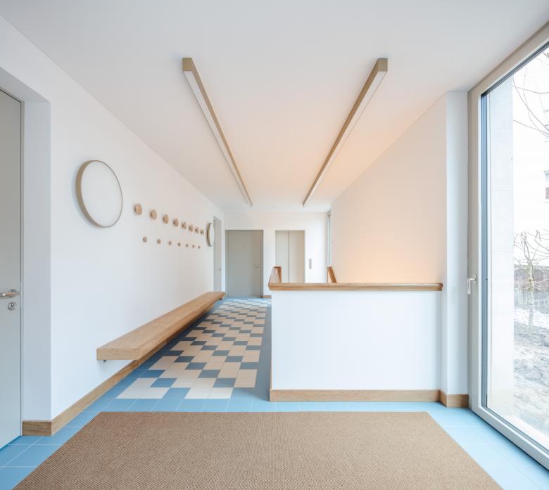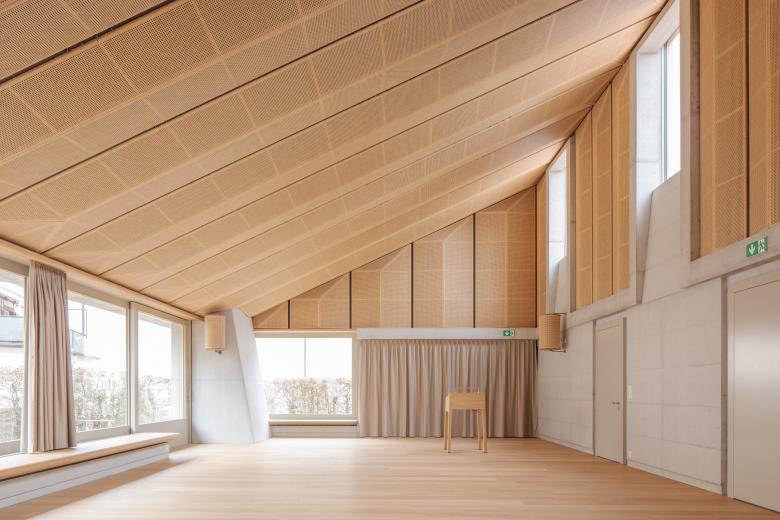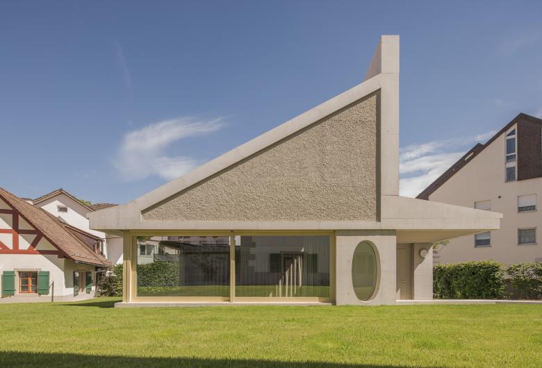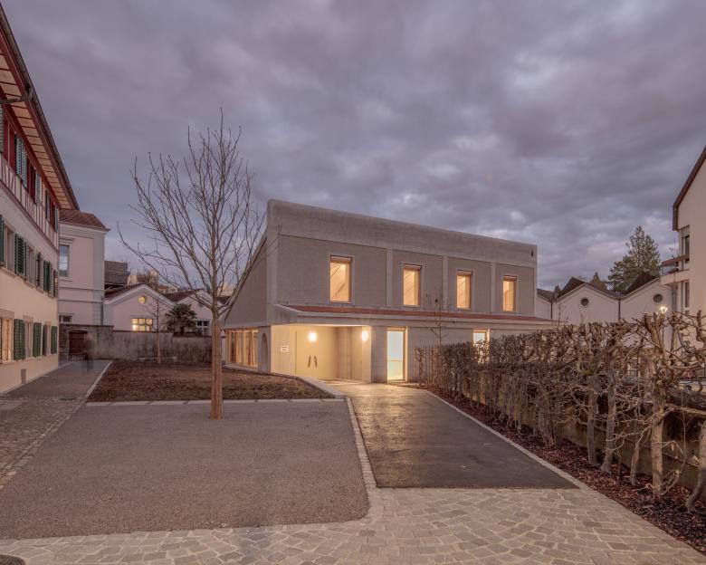 Das Grundstück ist sowohl aufgrund der bestehenden Bausubstanz wie auch wegen seiner Umgebung von historischer Bedeutung. Mit dem Umbau des alten Pfarrhauses und dem Neubau des Kirchgemeindesaals im ehemaligen Klostergarten werden alle öffentlich genutzten Räume der Kirchgemeinde zusammengeführt. Der Neubau des Kirchgemeindesaals integriert sich mit dem asymmetrischen Schrägdach selbstverständlich in das bestehende Ensemble. Er bezieht sich auf die historischen Gebäude gleichermassen wie auf die charakteristischen Dachlandschaften der benachbarten Industriegebäude. Der Baukörper duckt sich mit einer niedrigen Traufe zum Pfarrhof. Die grossen Fenster verstärken diese Wirkung des Gebäudes und schaffen vielfältige Durchblicke zum Hof.