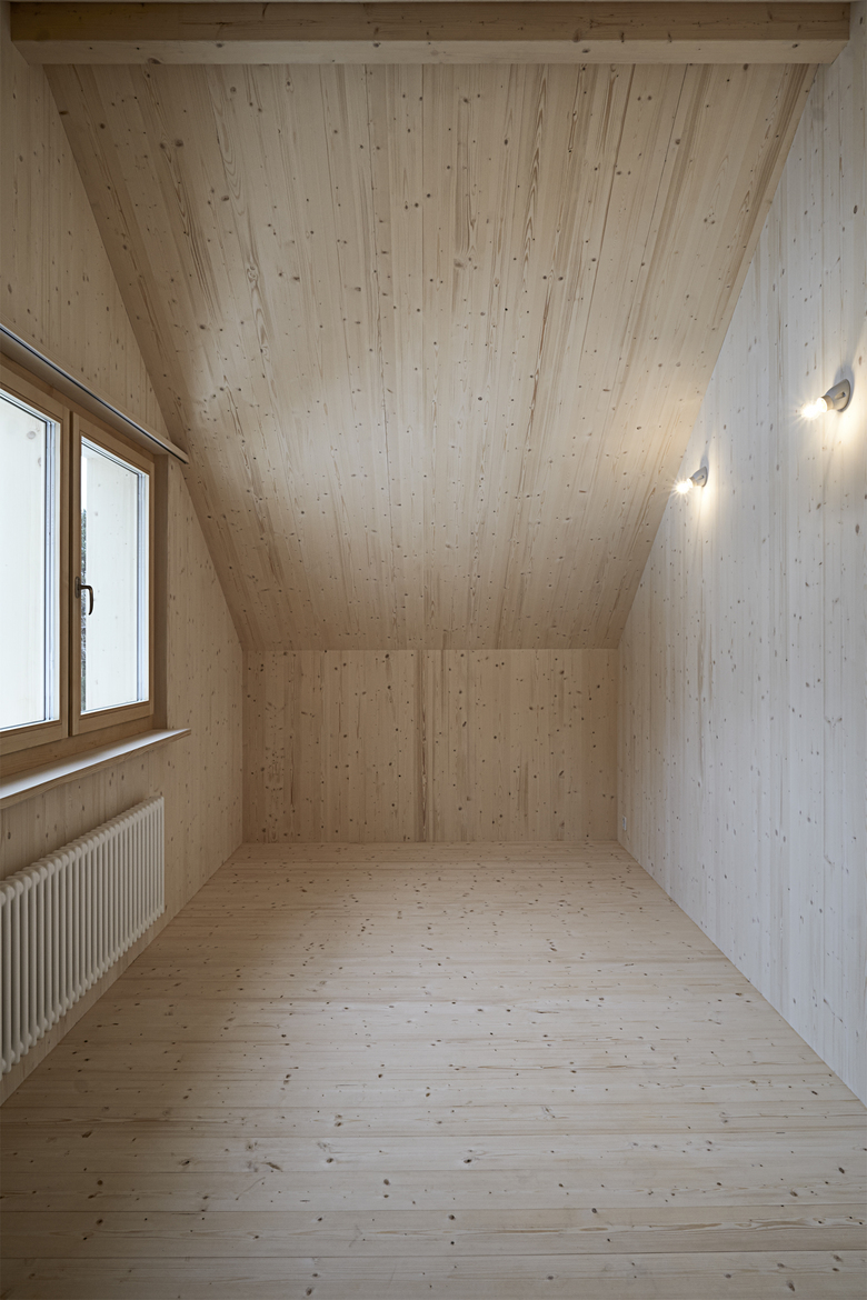 Der angebaute Scheunenteil, welcher zur Hälfte unterkellert ist, wurde im Zuge des Umbaus ausgebaut und erweitert die nordöstliche Wohnung um zwei Räume. Im Erdgeschoss war bereits vor dem Umbau ein provisorisches, ungedämmtes Bad untergebracht. Das Bad war sehr klein und kalt, was den Bauherrn zum Ausbau des Scheunenteils veranlasste. Das Erdgeschoss wurde in ein grosszügiges Bad mit inte­griertem Waschküchenbereich umgestaltet. Im Obergeschoss entstand ein kleines, zusätzliches Zimmer, das die Wohnung um den Ausblick nach Nordosten bereichert. Der Umbau ist ein reiner Holzbau, wobei die beiden Seitenfasssaden und das Dach innerhalb der äussersten Schicht der Gebäudehülle gedämmt wurde und die Giebelfassade komplett neu erstellt wurde. Die Nordostfassade wurde wieder mit einem für Appenzellerscheunen typischen Leistenschirm verkleidet. Die An­ordnung der drei Fenster im Obergeschoss erinnert an die typischen Fensterreihen bei Hauptwohnräumen von Appen­zellerhäusern und macht somit die neue Stube in der Fassade ablesbar. Die Innenräume wurden beide komplett in Fichtenholz ausgekleidet und mit einem UV-Schutz behandelt. Im Erdgeschoss wurden die alten Massivholzbohlen geschliffen und wiederverwendet.