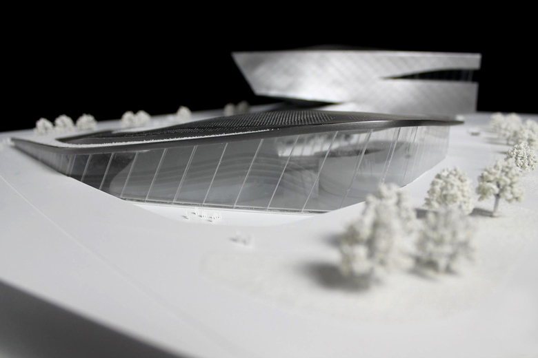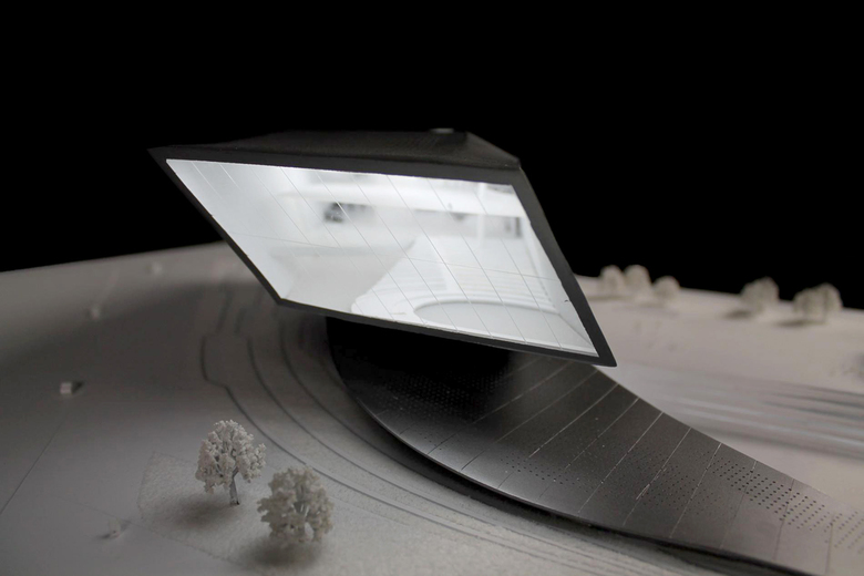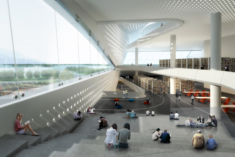 图书馆设计旨在创造打破陈规的创新建筑空间,吸引大连市民来到这一独特的建筑风景线。设计灵感来自中国古代长袍轻盈的流线以及盘根错节树根的稳定性和力度的结合。动态的建筑元素破土而出、与大地编织为一体,形成一系列庭院和地形起伏,生根于大地、向天空伸展,像一棵枝繁叶茂的大树,拔地而起为一个大胆的城市标志。通过体量的转换,营造出私密的庭院空间和动态延展的主楼视线。主楼空间内设置的一系列室内空间节点和梯田空间以加强了空间的层次感和连贯性。包含咖啡馆的一系列零售功能区域,将吸引更多的读者。在中心下客区域的多媒体中心具有独立的区域功能。