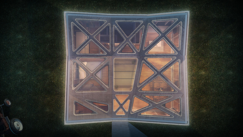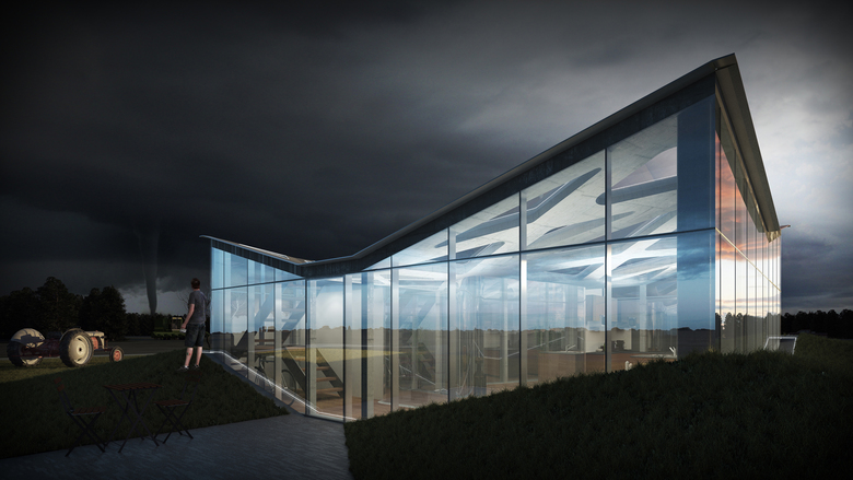 启动建筑这种运动的关键是发生与雷暴结合的龙卷大风,房屋外部成套的太阳能电池随日光的转移而伸缩旋转以获得最高的日照强度,凯夫拉尔纤维材料与夹在该材料中间的透明绝缘体共同形成了一种半透明的外部墙体,在对外部天气形成屏障的同时也使阳光得以漫射进建筑结构内部。此外,我们还探索研究了光催化涂料和碳纳米管在建筑外墙上吸附并清洁污染物的应用,外墙上的污染物将直接被转换为家庭燃料为家庭提供电力和水力。