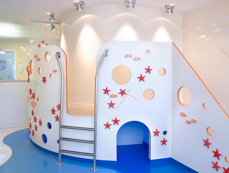 Die Kinderzahnarztpraxis bewegt sich in einer blauen Atoll-Unterwasserwelt, die sich sowohl angstreduzierend für Kinder als auch prozessoptimiert für Mitarbeiter, auszeichnet.