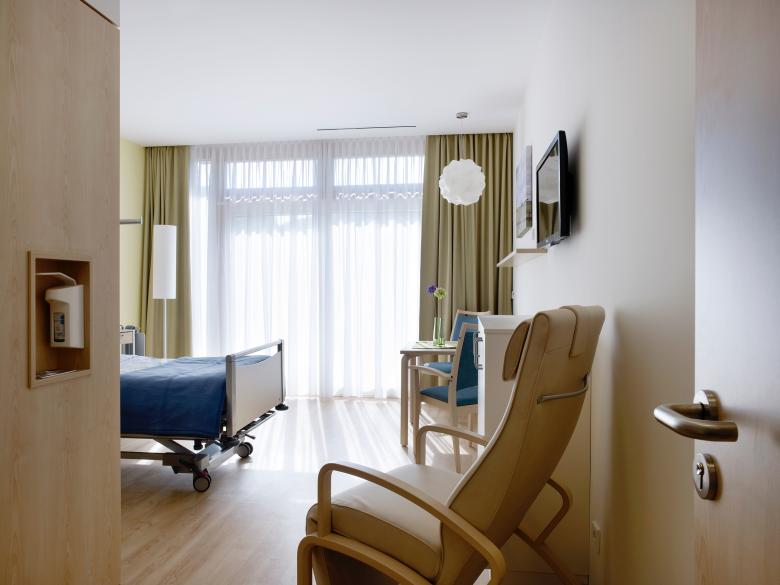 Der Hospizneubau 2011 war nach unserer Erfahrung im Gesundheitswesen so etwas wie die Königsdisziplin: Der Träger wünschte sich ein Hospiz, das sterbenden Menschen einen Ort der Freundlichkeit bietet, an dem sie mit Würde und in Geborgenheit ihren letzten Lebensabschnitt verbringen können. Ein Ort, an dem sie sich wohlfühlen können, der in häuslicher Atmosphäre Nähe zu anderen Menschen, aber auch Zurückgezogenheit zulässt. Ein sorgfältig ausgewähltes Farbkonzept, angenehme Materialien und Formen sorgen für eine lebensbejahende, positive Atmosphäre, in der sich Gäste, deren Angehörige und Mitarbeiter wohlfühlen.