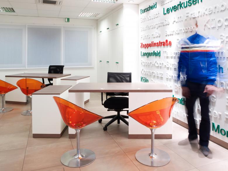 Das Leverkusener öffentliche Bustransport-Unternehmen Kraftverkehr WupperSieg (kws wupsi) bekam ein neues Kundenservice-Center. Kunden werden in einem inspirierenden Raum angenehm empfangen. Die außergewöhnliche Innenarchitektur gibt wupsi ein neues Gesicht und macht das Unternehmen außerhalb der Busse für die Kunden als Marke erlebbar. Klare Farben und innovative Materialien kontrastieren Holz, die Wandinstallation zeigt Bushaltestellen der wupsi. Der frühere Amtsstubencharme ist einem Markenerlebnis mit Charakter gewichen.