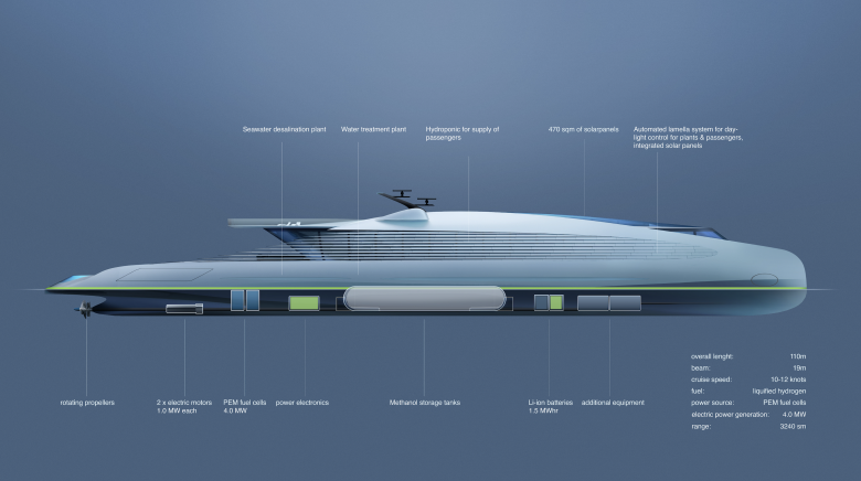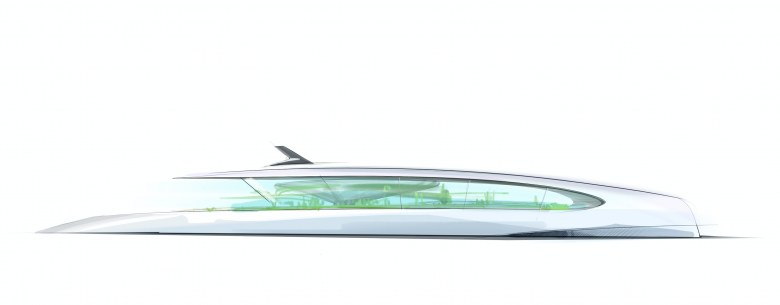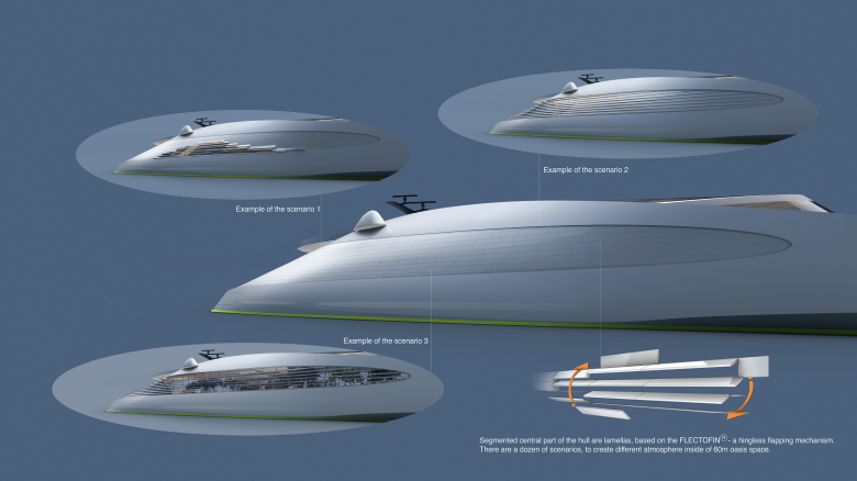 Das schlichte, elegante Äußere des Schiffes zeichnet sich durch eine homogene, geschlossene Form aus. Reduziert und stromlinienförmig leistet das Volumen möglichst wenig Widerstand gegen Wind und Wasser. Der Rumpf geht übergangslos in die seitliche Fassade bis zum Hochpunkt des Schiffes über. In die hochgezogenen Seitenwände sind sensorgesteuerte Lamellen integriert, die den Lichteinfall in die oberen Decks regulieren und bei schneller Fahrt und widrigem Wetter geschlossen werden können. Das geschützte flache Dach ist verglast und lässt Tageslicht in den Innenraum. Neben dem Glasdach sind auch die seitlichen sensorischen Lamellen mit transparenten Photovoltaikzellen belegt, die Strom für die Klimatisierung, Licht und die Entsalzungsanlage liefern. Der Steuerstand ist unkonventionell am Bug verortet, somit kann das hintere offene Sonnendeck übergangslos in ein großzügiges one-space Innenraumkonzept übergehen. Am offenen Heck befindet sich ein Salzwasserpool und eine kleine Marina mit direktem Zugang zum Meer.