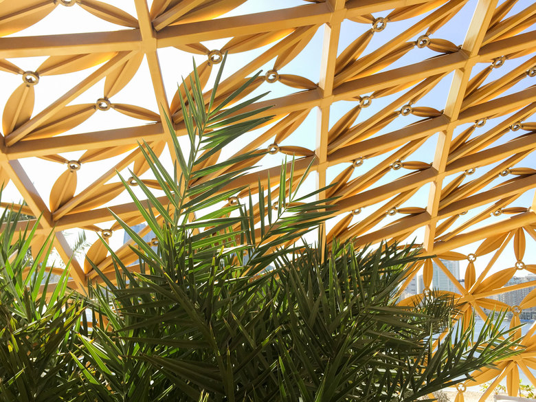 Licht ist ein zentrales Thema in der arabischen Kultur, und so legte man besonders Augenmerk darauf, die Goldtöne und Glanzgrade der Materialien zu einem farblich homogenen Ganzen abzustimmen. Die Herausforderung bestand darin, dass die unterschiedlich beschichteten und farblich gefassten Bauteile Sonne und Salzwasser trotzen und somit maritimen Anforderungen genügen mussten. Stahlträger wurden in einem Sonderfarbton lackiert, Knoten pulverbeschichtet und Blüten eloxiert.