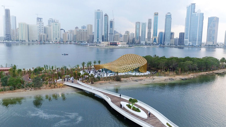 Noor Island Park: eine brachliegende Insel vor der Küste der Wüstenmetropole Sharjah, verwandelt in einen transmedial inszenierten Landschaftspark als neuen Typus urbanen Raums. Der Butterfly Pavilion mit seinem weithin sichtbaren, goldglänzenden Schattendach bildet das architektonisches Kernstück. Die beeindruckende, organisch geformte Stahlkonstruktion des zentral gelegenen Schmetterlingshauses ist über und über mit sternförmigen Metallblüten besetzt. Durch das einfallende Sonnenlicht werfen sie ornamentale Muster auf den innenliegenden Glaspavillon. Neben einer tropischen Regenwaldlandschaft mit rund 500 exotischen Faltern beinhaltet das expressiv gestaltete Bauwerk einen Souvenirshop und ein atmosphärisches Café.