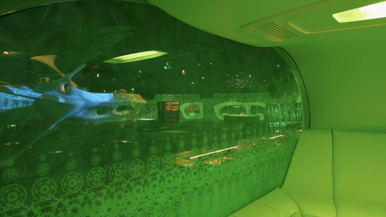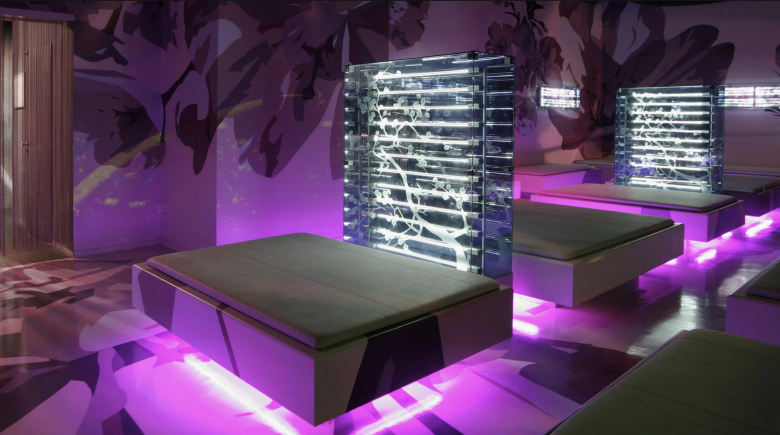 Vom Entree werden die Besucher zu einer von 8 großen Liegeflächen geleitet, die durch semitransparente Gazevorhänge voneinander getrennt sind. Auf jedem der weichen Polsterelemente finden bis zu neun Personen bequem liegend oder sitzend Platz. Die exquisiten Speisen und Getränke werden auf edlen Glastabletts gereicht und können sodann in Ablagemulden in den umlaufenden Lehnen der Betten abgestellt werden.