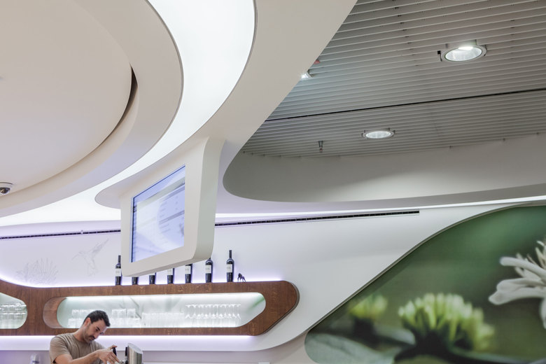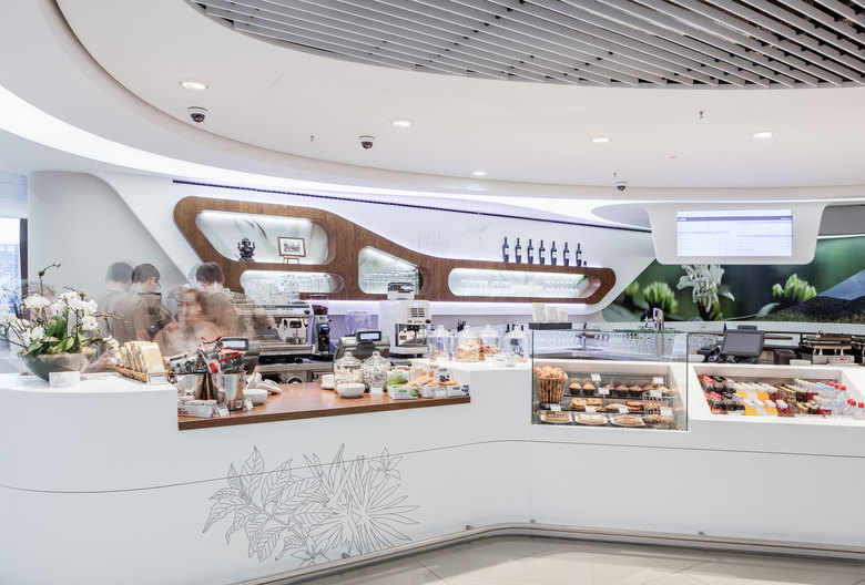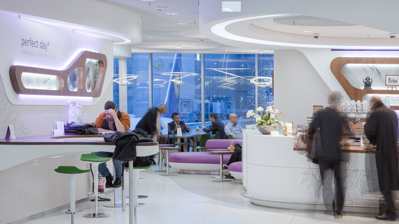 Die innenarchitektonische Gestaltung des perfect day schafft eine einladende, von Licht erfüllte Atmosphäre. Ihre ansprechende Wirkung beruht auf dem ausgewogenen Zusammenspiel organischer Formen mit kontrastreich eingesetzten Farben und Materialien sowie stimmungsvollen Beleuchtungsszenarien, die tageszeitlich variieren. Entlang der geschwungenen Konturen des maßgefertigten Mobiliars entwickelt sich ein fließendes Raumkontinuum, das aus dem vorderen Verkaufs- und Ausschankbereich in die dahinter liegende Lounge mit Airside-Panorama leitet. Das perfect day bietet seinen Gästen eine anregende und zugleich erholsame Umgebung, in welcher der Mensch und sein Wohlbefinden im Mittelpunkt stehen.