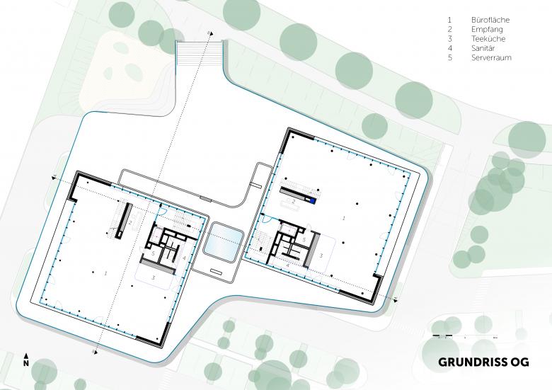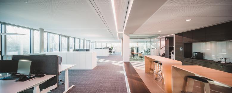 Die Büroetagen sind großzügig und offen konzeptioniert, auf Innenwände wurde weitgehend verzichtet. Hierarchiefreies und kooperatives Arbeiten sind in der Gebäudestruktur angelegt. Kommunikative Gemeinschaftsbereiche und konzentrierte Arbeitsbereiche durchmischen sich unaufdringlich mit urbanem Mobiliar. Das Konzept des papierlosen Büros ermöglicht leichte, transparente Möblierung und weitgehend unverstellte Blicke nach draußen. Über eine eigens vom Bauherren entwickelte App steuern die Mitarbeiter so ziemlich alles im Haus: sie können ihr Lunch aus der hauseigenen Foodbar auswählen oder sich in der Pause durch die umgebenden Grünanlagen navigieren lassen. Zur Plastikvermeidung wird Wasser aus dem eigenen Trinkbrunnen zur Verfügung gestellt, der Teppich wiederum besteht aus recycelten Fischernetzen und Plastikflaschen. Moderne Heiz- und Kühldecken sorgen in den Büros für angenehmes Raumklima. Notwendige Kälte und Wärme wird über Geothermie mit 24 Sonden in 130 Meter Tiefe generiert und Strom mit einer Photovoltaikanlage auf dem Dach produziert, womit das Gebäude zu einem 0-Energie Haus wird.