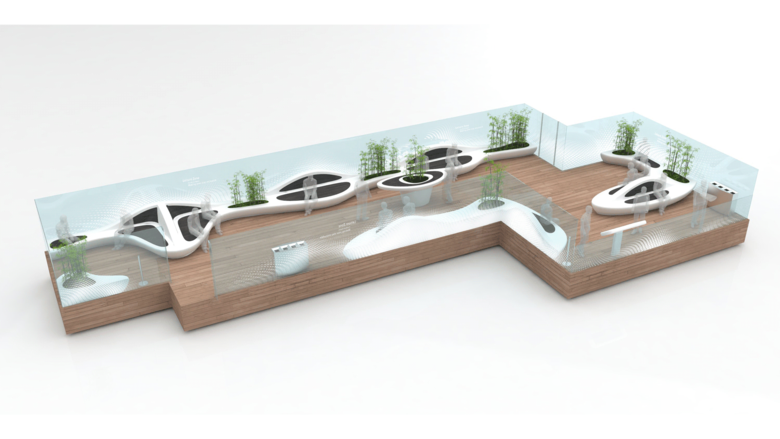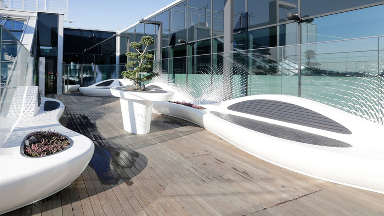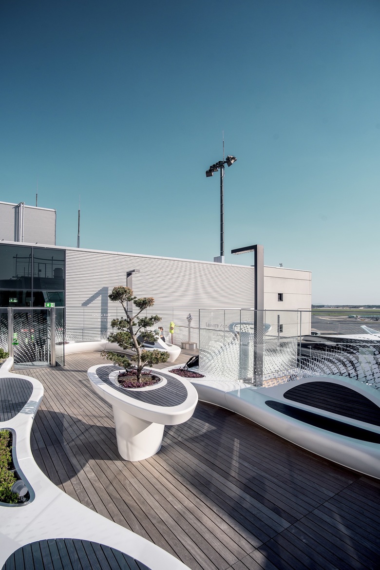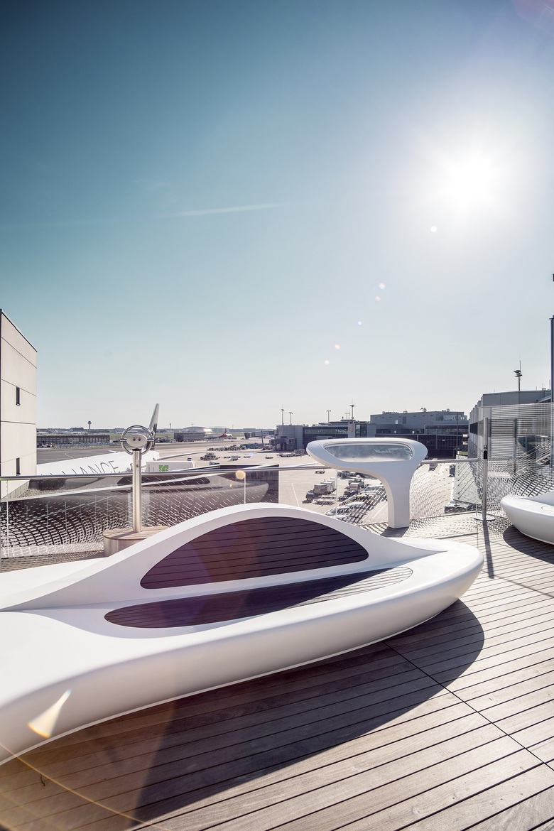 Die Terrasse ist Teil der ‚Leisure Zone‘-Serie, einer Reihe von einladenden Wartebereichen inmitten des umtriebigen Flughafenumfelds. Als zentrales Gestaltungselement werden die dynamisch geschwungenen Sitzmöbel der Indoor-Lounges wiederaufgenommen, die hier im Außenbereich mit Holzelementen und integrierten Pflanz-Inlays versehen sind. Im Fokus steht das Wohlbefinden der Fluggäste. Das modulare Mobiliar aus weißem Mineralwerkstoff ermöglicht verschiedene Sitz- und Liegepositionen und mit ihrer hellen, positiven Atmosphäre hebt sich die Dachterrasse deutlich von konventionellen, häufig starr und linear gestalteten Wartebereichen ab.