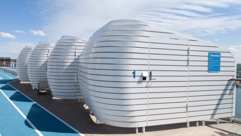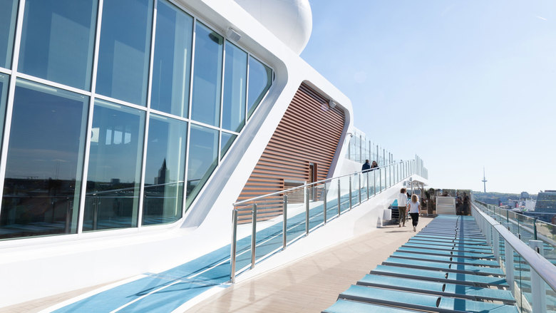 Ein modernes und anspruchsvolles Angebot an sportlichen Aktivitäten ist wesentlicher Bestandteil der TUI Cruises Philosophie. Neben der Joggingstrecke unterstreicht auch die von 3deluxe gestaltete ‚Arena‘ diesen Anspruch. Die große überdachte Halle bietet zahlreiche Sportmöglichkeiten von Kletterwand über Indoor Cycling und TRX-Ganzkörper-Workout und ist zusätzlich als Veranstaltungsfläche nutzbar.