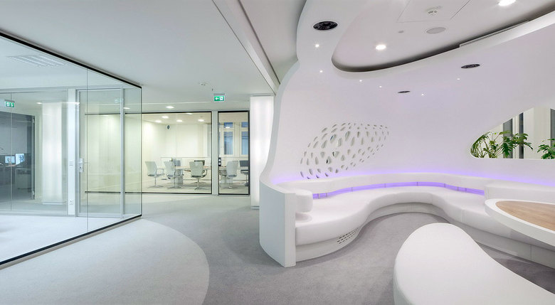 In zentraler Innenstadtlage nahe der Frankfurter Börse entstand auf 950 qm eine inspirierende Arbeitsumgebung, die auf atmosphärische Weise die zukunftsorientierte Unternehmenskultur von Syzygy zum Ausdruck bringt. Eine in die Bestandsarchitektur eingefügte, 22 m lange Freiform ist optischer und kommunikativer Mittelpunkt des Büros. Sie vereint Zonen für informelles Arbeiten und Rekreation in einer fließend geformten Lounge-Landschaft und bietet Besuchern Einblicke in das kreative Agenturleben.