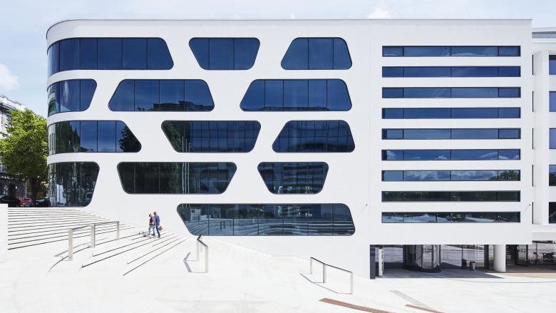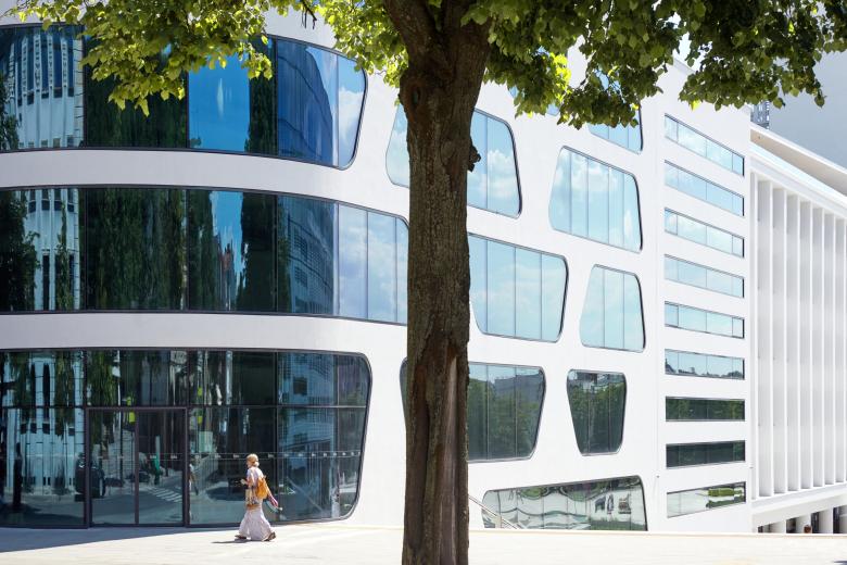 Durch ein außergewöhnliches Design, das die weitreichenden Fassaden hell inszeniert, moderne work spaces schafft und den Platz mit organisch geformten Grünflächen, geschwungenen Wegen, Sitzstufen und neuester Technologie in ein inspirierendes Terrain mit urbanem Ambiente verwandelt.