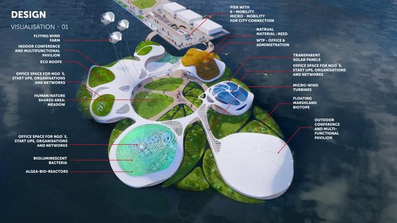 Die die Gebäudeidee prägendste Maßnahme sind die schwimmenden Sumpfbiotope, die 50% der Grundflächen ausmachen. Aber nicht nur hier wird Lebensraum für Flora und Fauna geschaffen, auch die Wildwiese, das Sandbiotop und die Reet- und Gründächer schaffen Lebensraum für eine diversifizierte, städtische Tier und Pflanzenwelt. Die Baumaterialien teilen sich in natürliche Materialien wie Holz, Lehm und Reet und recycelte Materialien wie z.B. Bioplastik auf. Neuste Oberflächentechnologien zur Luftreinigung werden ebenso eingesetzt wie Algenreaktoren, Windfarmen, Photovoltaik und Strömumgskraftwerke unter der Plattform zur Energiegewinnung.