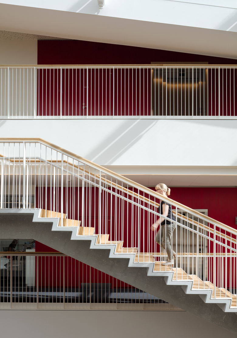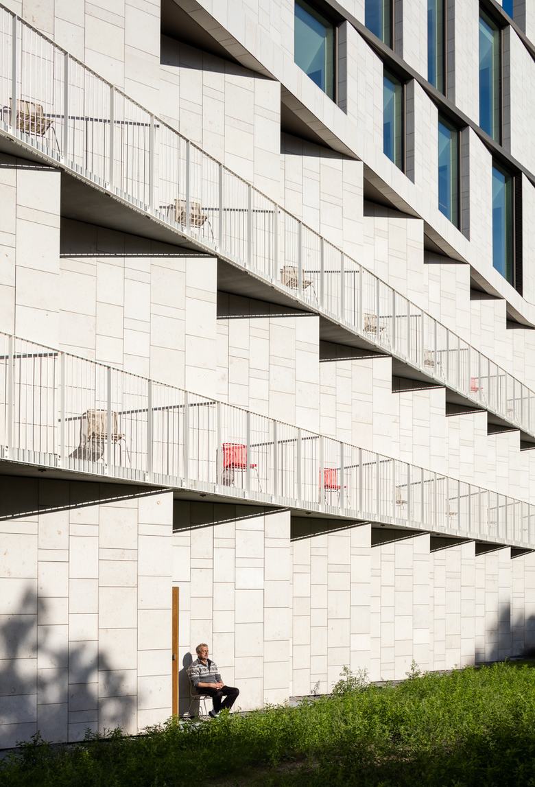 The building appears as two stacked, juxtaposed ‘Vs’. This form establishes a clear visual separation between the two programmatic functions: patient hotel and hospital administration. The facade appears as a horizontal relief clad with light natural stone, which adds a strong character to the building while also allowing it to shade itself. Two sky lit atria bring natural light deep into the building and function as arrival areas and gathering places for the Patient Hotel. Open staircases in both atria connect the individual floors.
