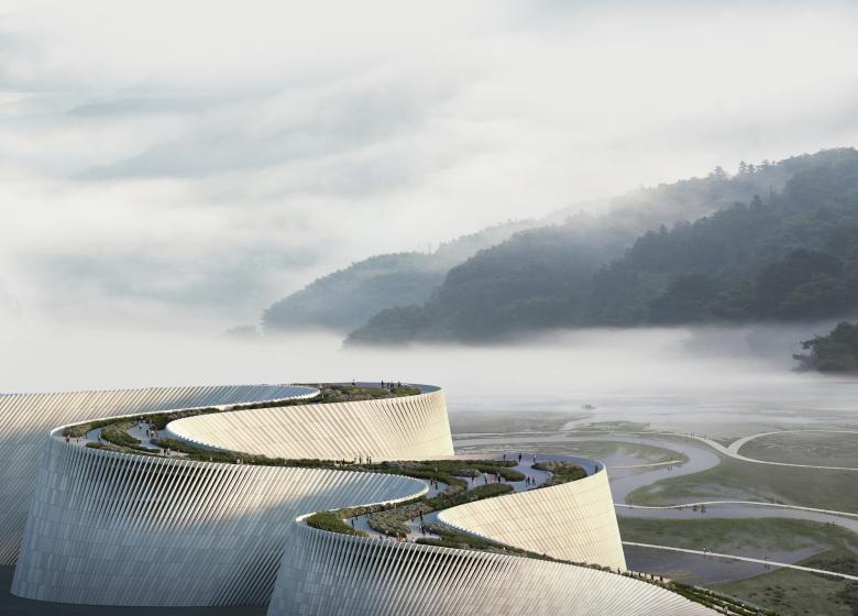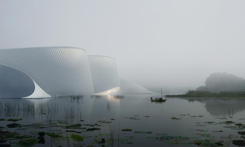 The winning design scheme, entitled “Delta”, rises seamlessly from the river delta, inviting visitors and residents to journey along its accessible green rooftop.