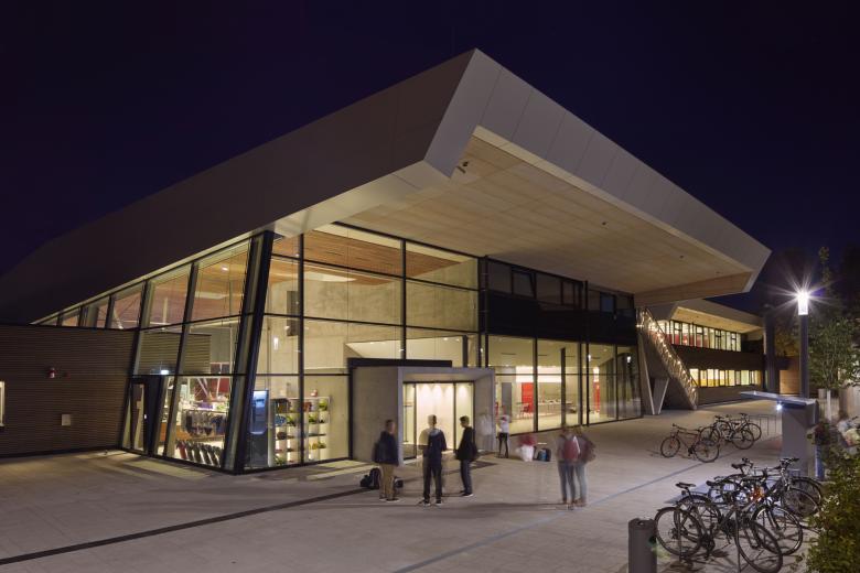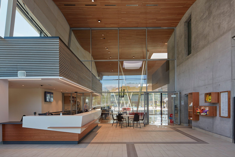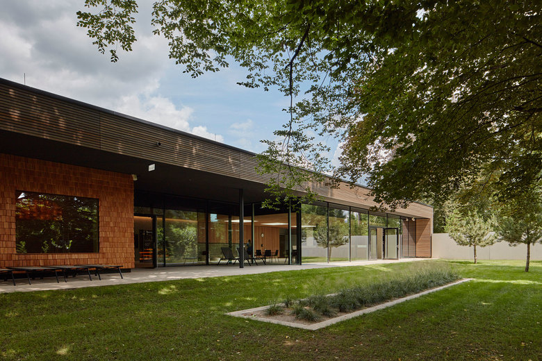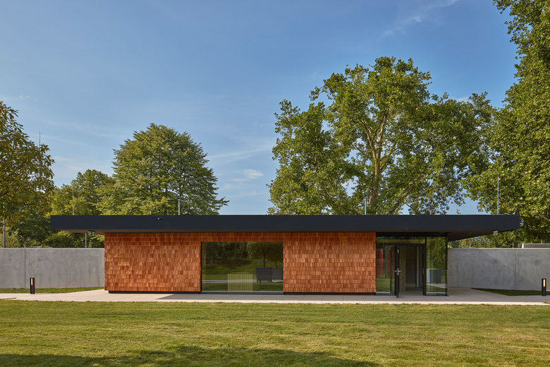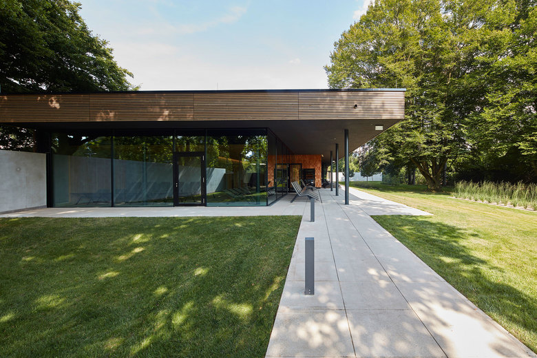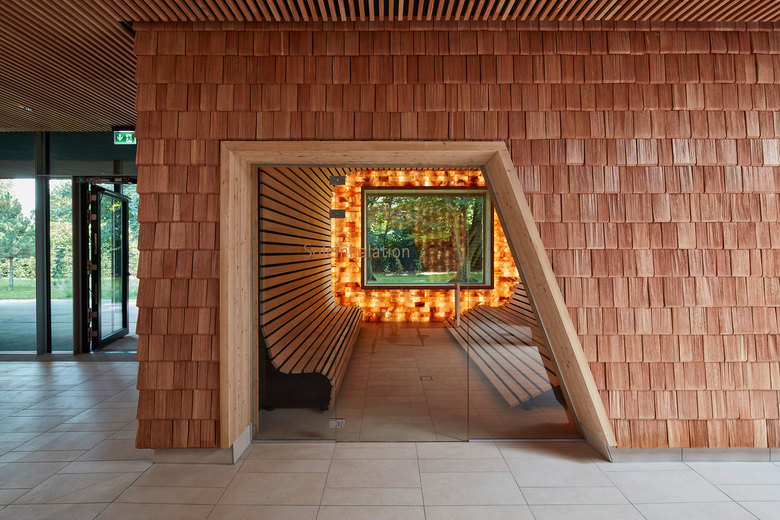 Inmitten der idyllischen Parklandschaft des Offenburger Bürgerparks befindet sich das neue Freizeitbad. Prägend für die Gestaltung des Gebäudes war das ausgewogene Zusammenspiel von Architektur und Landschaft: Weitläufige Dachflächen, großzügige Glasfassaden und atmosphärische Raumvolumen verzahnen sich mit der natürlichen Umgebung und bilden einen spannungsvollen Kontrast zwischen gebauter Umwelt und Landschaftsraum. Das Bad bildet im Westen des Grundstücks eine Schnittstelle zwischen Stadt und Park. So ist der zweigeschossige Eingangsbereich für Besucher, die zu Fuß über den Bürgerpark kommen, als Landmarke bereits weithin sichtbar.