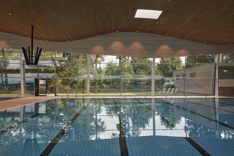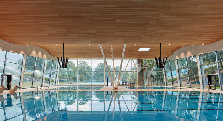 Architektonisch gliedert sich das Freizeitbad in drei Baukörper für die Bereiche Freizeit, Sport und Wellness. Diese lösen sich nach Osten hin auf und verzahnen sich über den Außenbereich behutsam mit der Parklandschaft. Weit auskragende Dachflächen, die sich mit großzügiger Geste in entgegengesetzter Richtung aufschwingen, prägen das Gebäude von außen. Über die transparent gestaltete, zweigeschossige Eingangshalle gelangen die Besucher in die Badehallen sowie den separaten Saunabereich und in den Sommermonaten in das Freibad. Die Badehallen sind in zwei Bereiche gegliedert: Im Nordosten das Freizeitbad mit direkter Anbindung an das Freibad und die Gastronomie und im Südosten das Sportbad. Die Trennung erfolgt über eine eingeschossige Badehalle für den Kursbereich. Blickfang in den zwei Badehallen ist eine geschwungene Holzlamellendecke, welche sich in sanfter Wellenbewegung zum Landschaftsraum hin anhebt. Der Saunabereich mit seinem großzügigen Saunagarten schließt das Gebäude im Süden ab. Eine Außensauna im weitläufigen Saunagarten bietet den Saunagästen einen besonderen Rückzugsraum mit Ausblick in die schöne Parklandschaft.