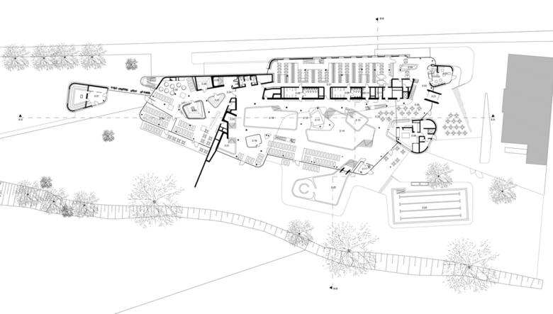 Ein wiederkehrendes Thema bei der Gestaltung der Therme ist der Flusskiesel, wie er auch am Ufer der Lahn vorzufinden ist. Dieser zeigt sich in der Formgebung der einzelnen Baukörper, der Schwimmbecken sowie bei den Fassadenöffnungen und auch bei der Wandgestaltung im Innenraum. Darüber hinaus greift die Therme auch in ihrer Materialität die Charakteristik von Kieselsteinen auf. Die einzelnen Baukörper formen mit ihrem Volumen unterschiedliche Steine, die ähnlich wie Kieselsteine am Flussufer geschichtet sind und sich einander überlagern. Im Zentrum befindet sich die Badehalle – weiträumig und großzügig gestaltet bildet sie das größte Element. Der Saunatrakt schließt nach Westen an. Mit markanter Kieselform schieben sich die zwei Baukörper, welche Gastronomiebereich und Shop beherbergen, in das Gesamtvolumen der Badehalle. Ein besonderer Blickfang sind die kieselförmigen Ausschnitte in der Nordfassade. Die asymmetrischen Öffnungen verleihen dem Baukörper auf der innerstädtisch zugewandten Seite ein lebendiges und heiteres Erscheinungsbild.