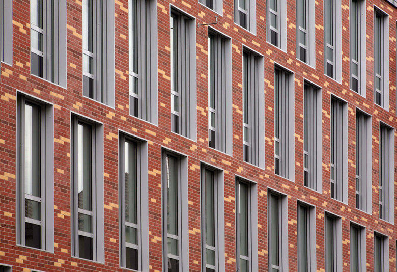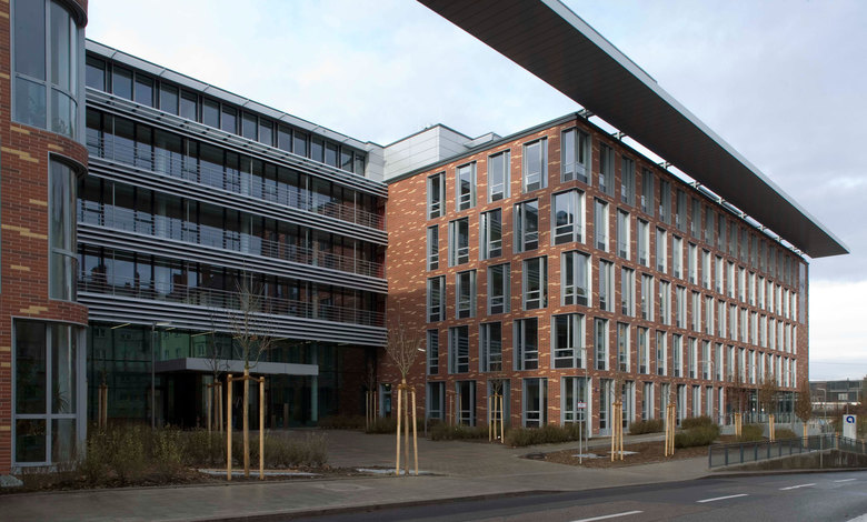Ziegelfassade – Konstruktion – Die Ziegelfassade ist eine hinterlüftete Konstruktion, bestehend aus Dämmung, Hinterlüftung und massivem Ziegelsteinen. Die Klinkersteine sind in einem Sonderformat projektbezogen hergestellt, angepasst an das Gebäuderaster, bzw. Ausbauraster. Sonderformsteine gibt es auch an der „runden Ecke“. Befestigt sind die Klinkersteine am Stahlbeton-Rohbau mit Edelstahlankern. Die Fassaden-Entwässerung verläuft in der Ebene der Hinterlüftung. Die Fassade wurde vor Ort aufgemauert. Die Ziegelsteine wurden in drei verschiedenen Farben gemischt, einem Grundton mit einem helleren und einem dunkleren Stein. Zur Sicherstellung einer gleichmäßigen Farbstruktur wurde die Lage jedes Steins im Plan festgelegt. Die hochwertige Gebäudehülle führt in Kombination mit der Nutzung von Fernwärme zum Heizen und Grundwasser zum Kühlen zu einem Primärenergieverbrauch, der über 40 % unter den Anforderungen der ENEV2007 liegt.