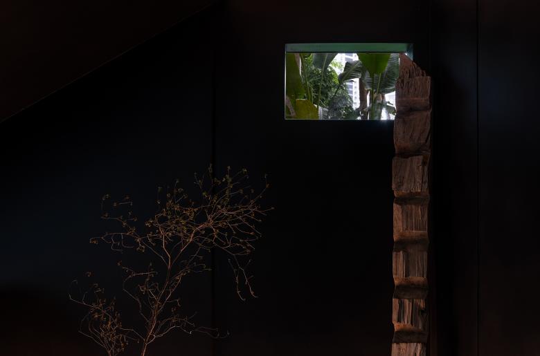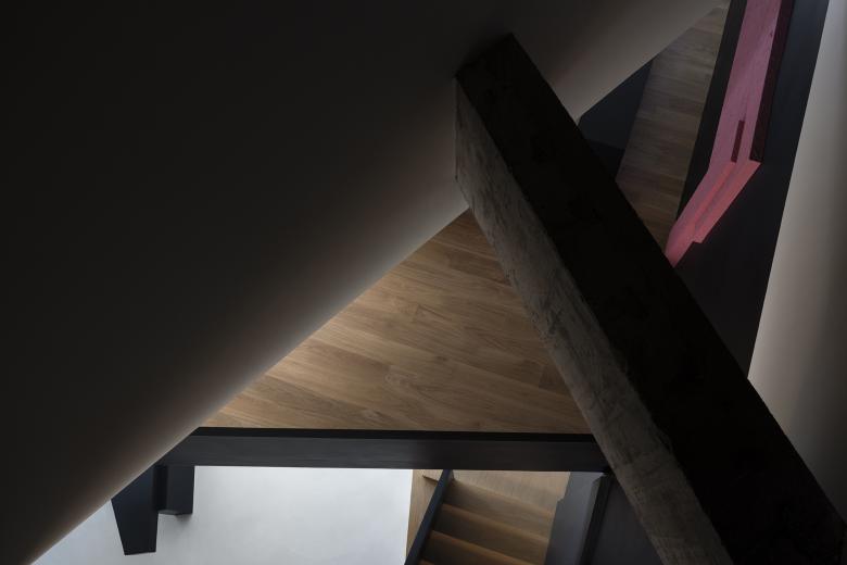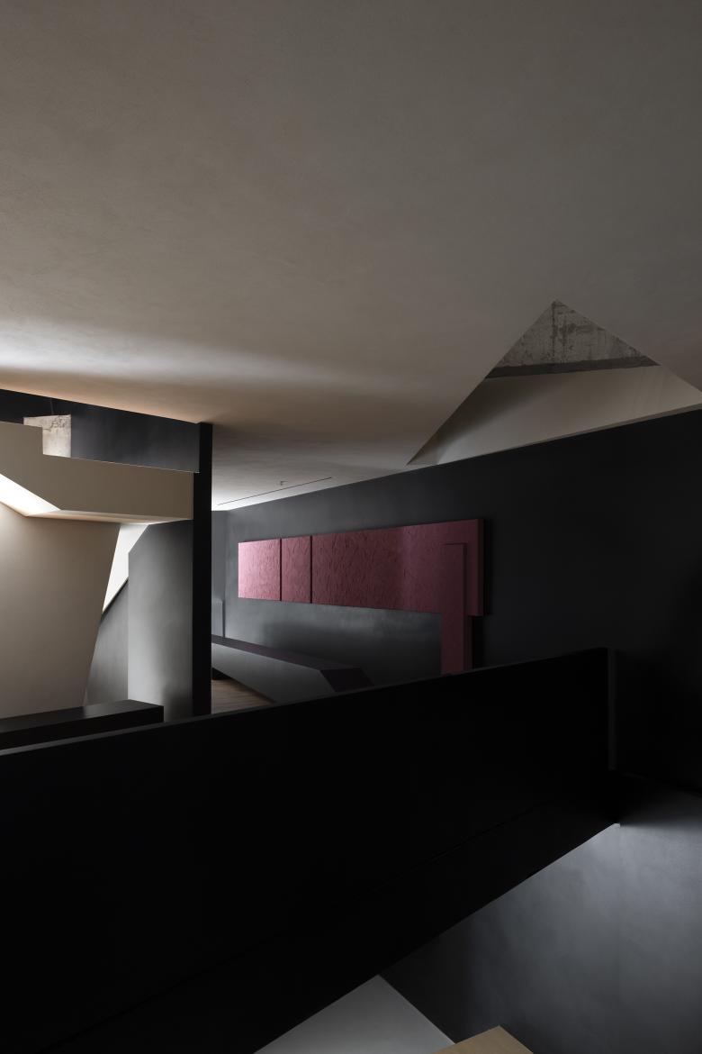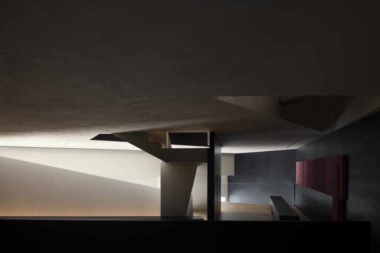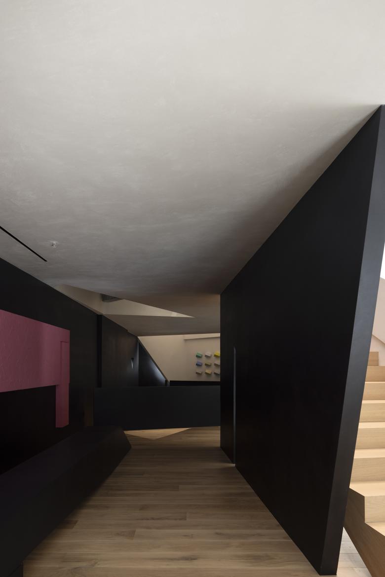 During construction, the concrete structural beams were naturally exposed, resulting in an unintentional yet striking design feature. The triangular relationships within the space naturally form diagonals and slanted surfaces, completing the spatial composition through the flow of people.