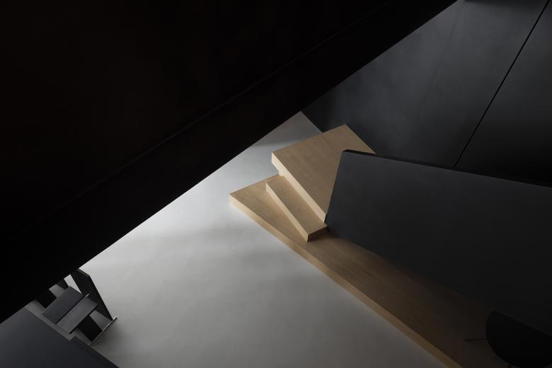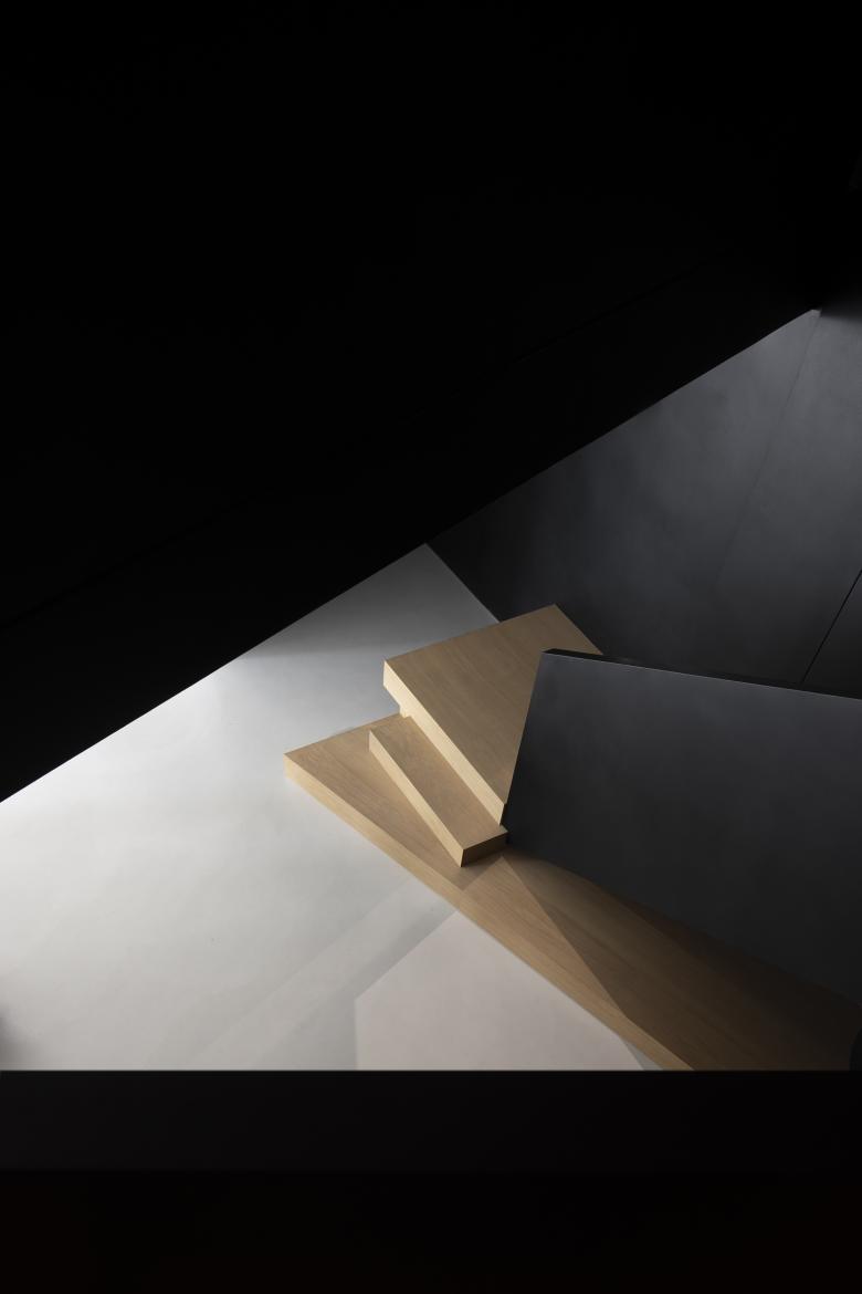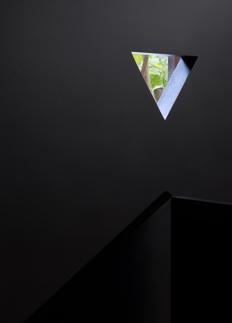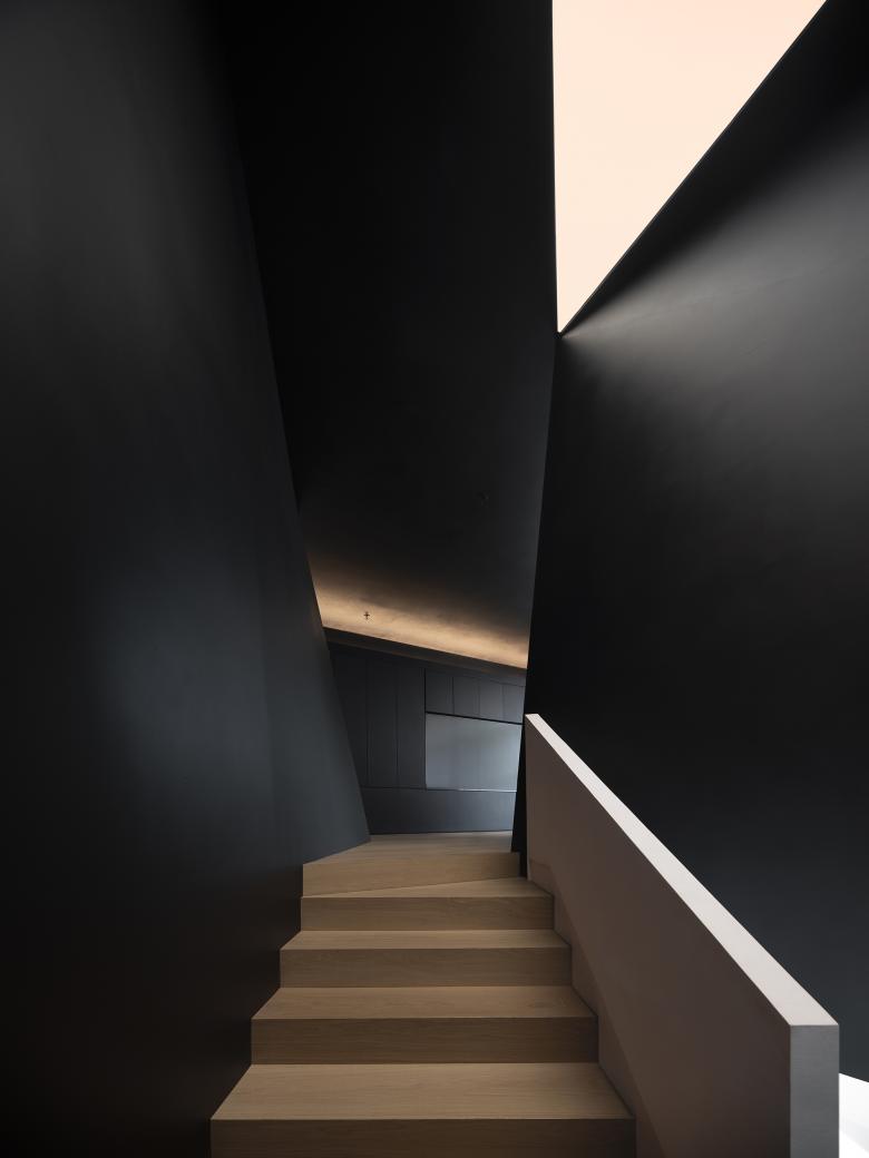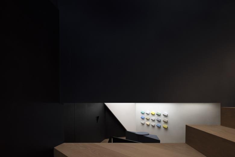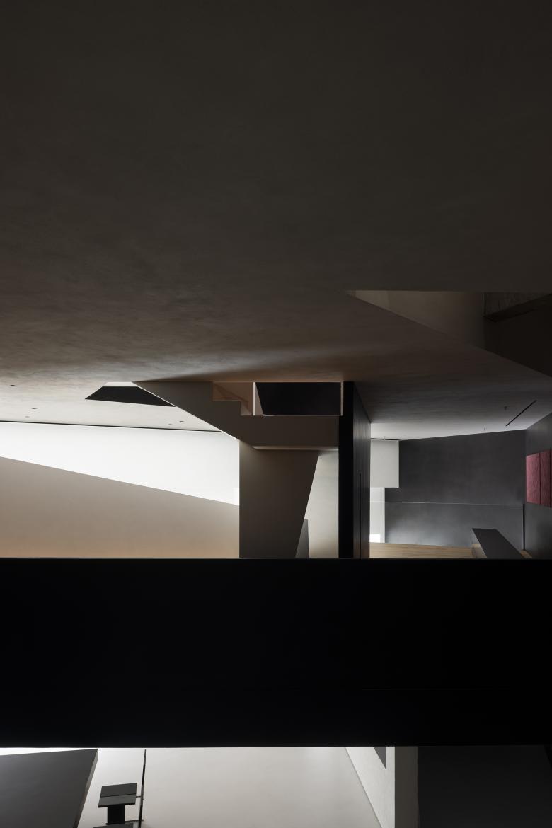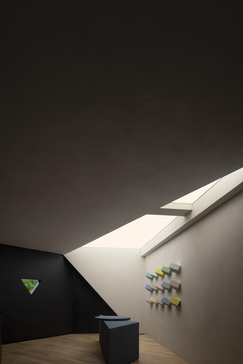 Throughout this visiting circulation, an exploratory experience is created. The inverted triangular opening of the mezzanine cleverly introduces the view of outdoor trees into the space, offering a unique visual experience. On the first floor, the visual experience highlights spatial infinity, while the mezzanine provides a perspective that connects the first and second floors, showcasing their contrasting yet integrated relationship. The staircase to the second floor, although linking the mezzanine and the second floor, visually centers on the first floor, providing an unexpected visual delight.