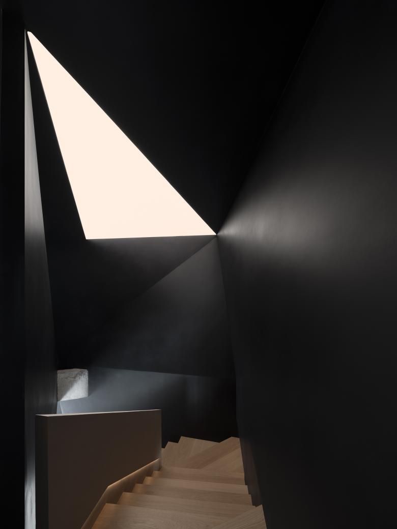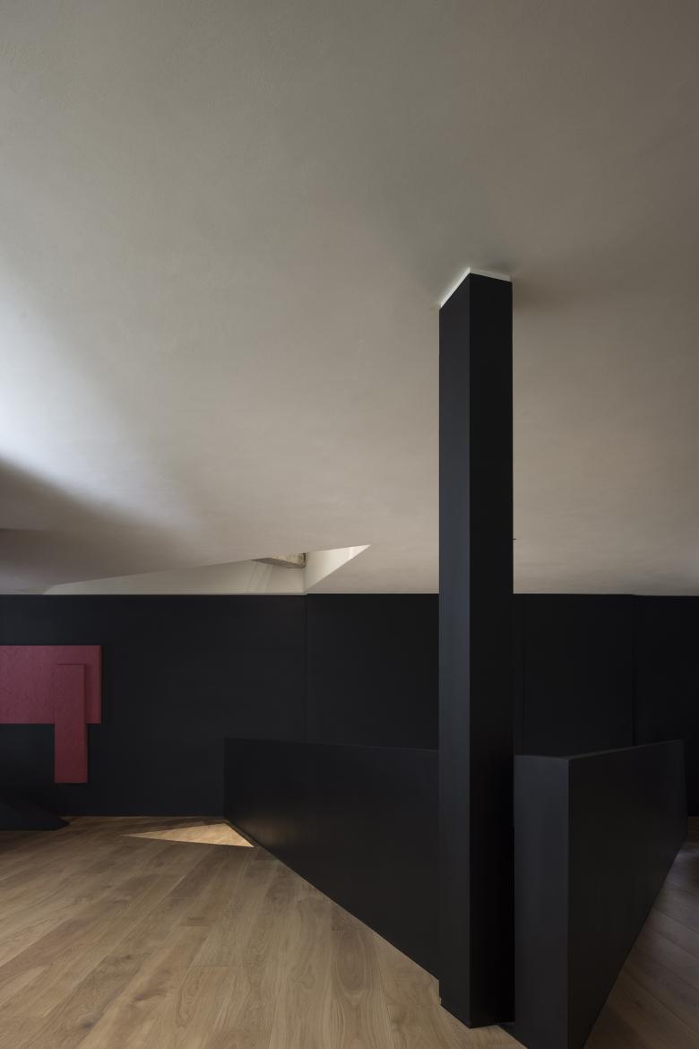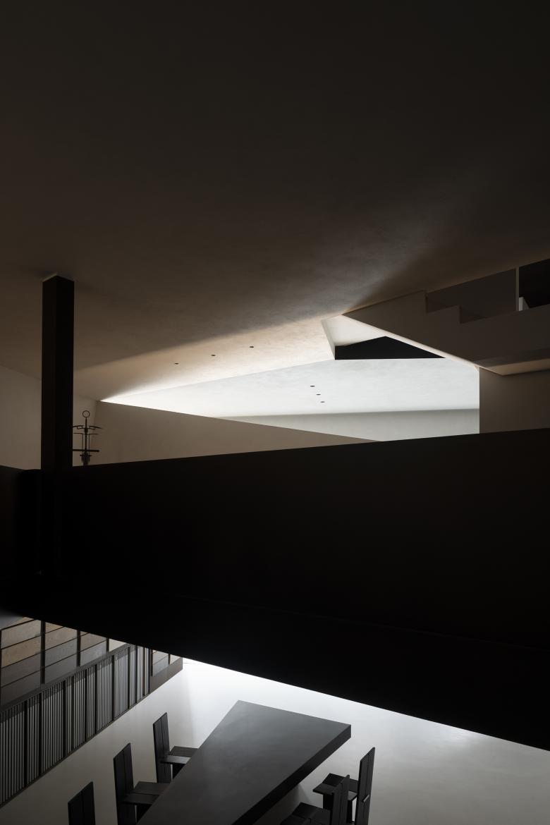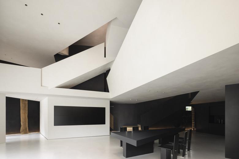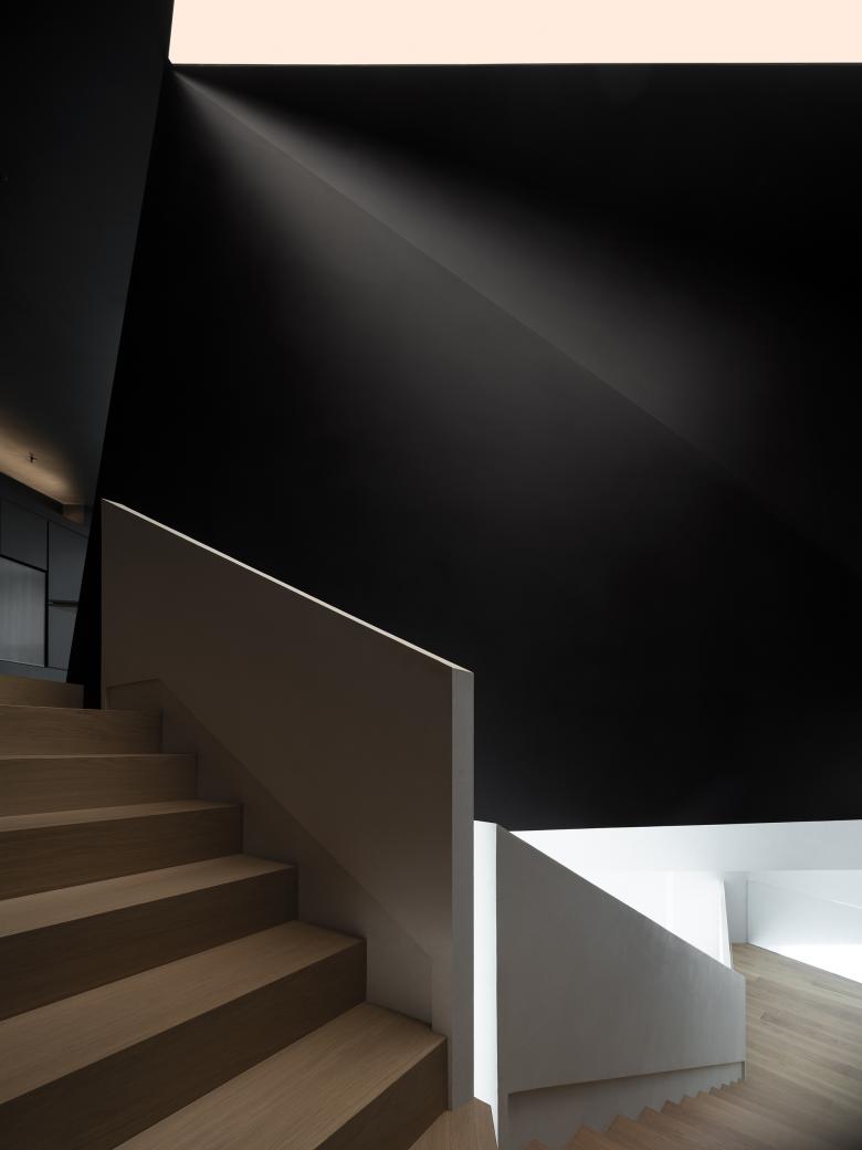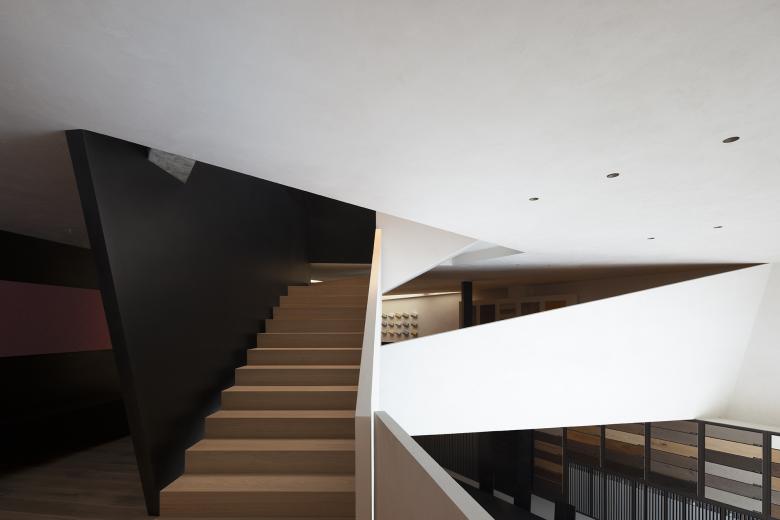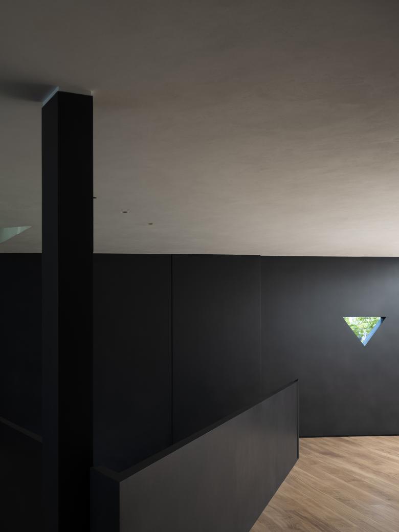 Throughout this visiting circulation, an exploratory experience is created. The inverted triangular opening of the mezzanine cleverly introduces the view of outdoor trees into the space, offering a unique visual experience. On the first floor, the visual experience highlights spatial infinity, while the mezzanine provides a perspective that connects the first and second floors, showcasing their contrasting yet integrated relationship. The staircase to the second floor, although linking the mezzanine and the second floor, visually centers on the first floor, providing an unexpected visual delight.