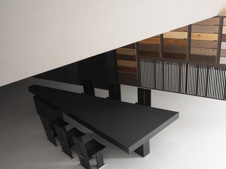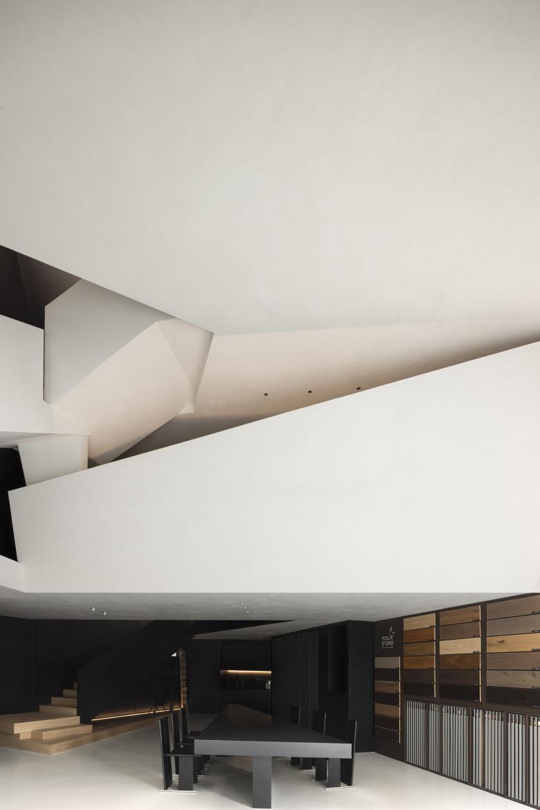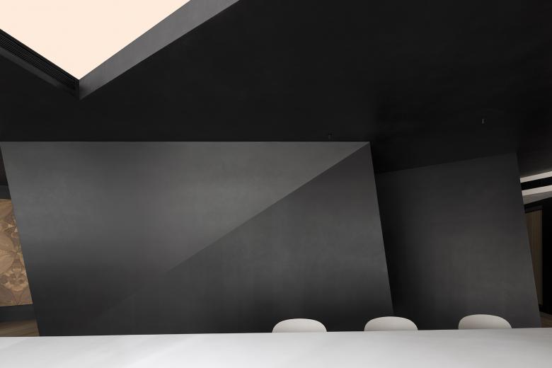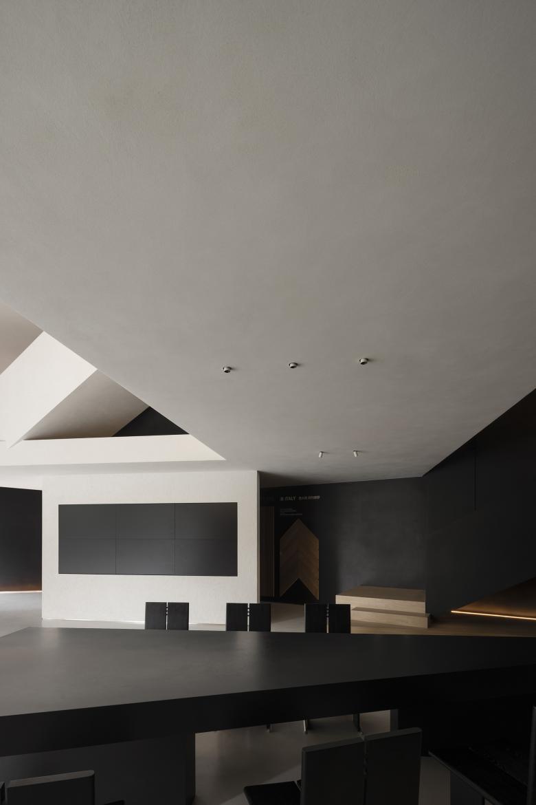 By deconstructing and reinterpreting the slanted spatial form, a new charm emerges through the organic organization of diagonal lines within various functional areas. The orderly product displays on the black background walls accentuate the warmth and texture of the wood. The central reception tea table serves as a negotiation area during regular times and can also become the focal point for meetings and salons.