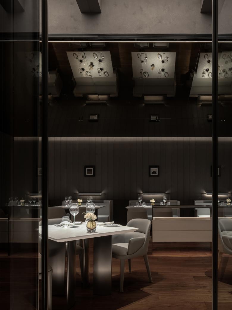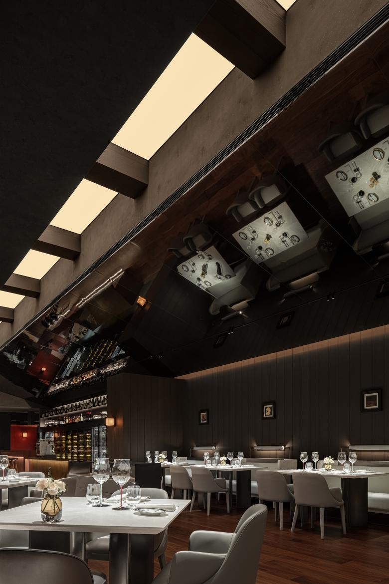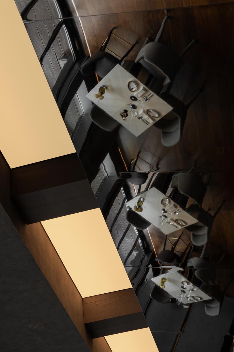 The service bar at the reception foyer is a centerpiece of the interior. It not only enhances the overall atmosphere, but also optimizes the circulation of the space, enhancing guest services. The service bar integrates various functions, including reception, wet bar, cashier counter, and the display of wine and steaks, showcasing high functionality and accentuating the distinctive identity of the restaurant. Upon entering the space, the guests are immediately immersed in the brand's catering culture and sophistication in its culinary offerings.