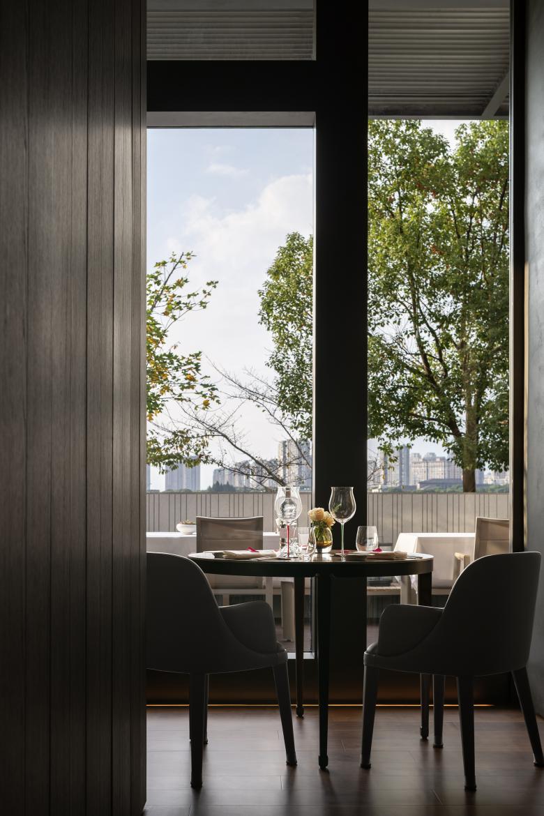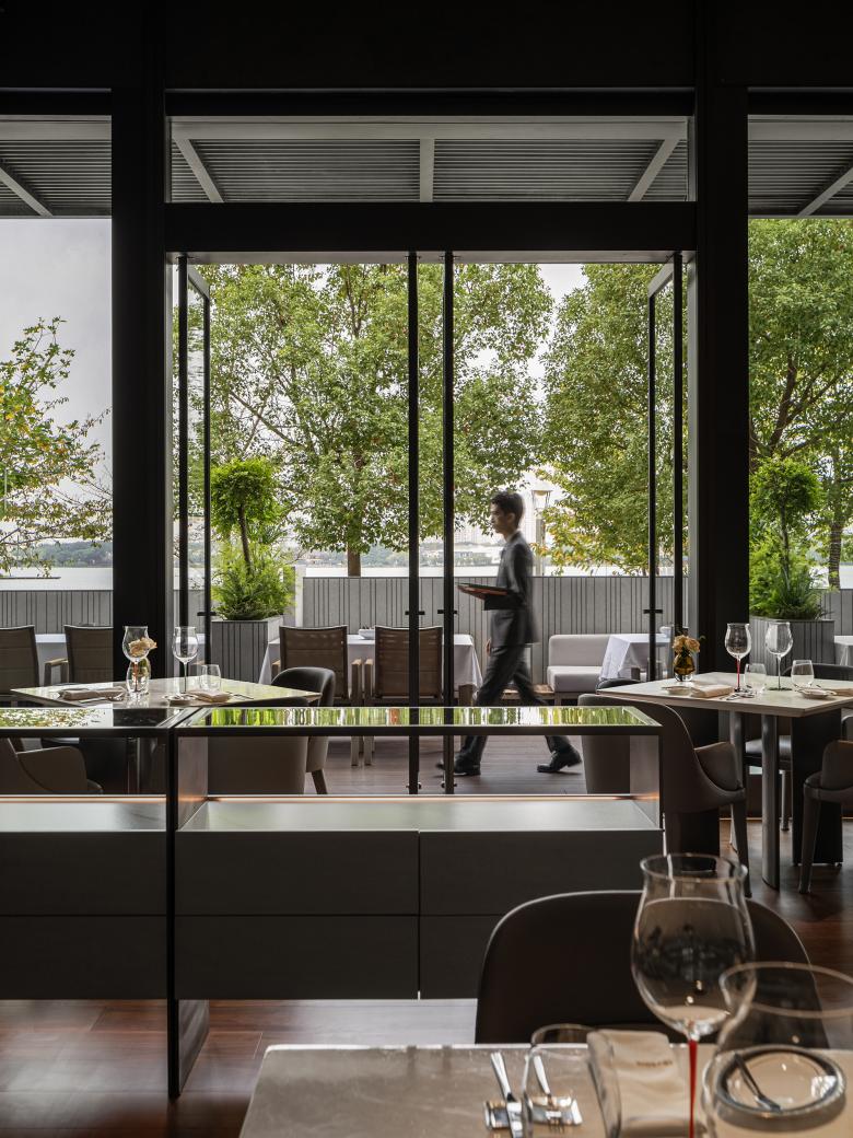 Located on the ground floor of the mall's rear outdoor platform, the restaurant's entrance offers a picturesque view of Taihu Lake. The dining experience begins before stepping into the interior. An outdoor dining area seamlessly blends with the entrance, creating a street-front commercial atmosphere which evokes a leisurely and relaxing lifestyle. The unpretentious entrance leaves more space to the outdoor dining area, enhancing the efficiency and overall space mood, to engage with customers.