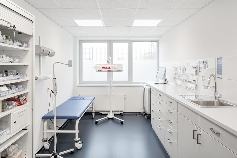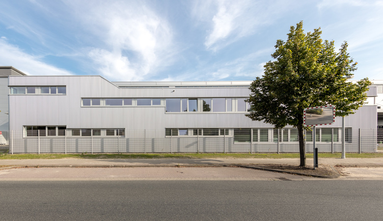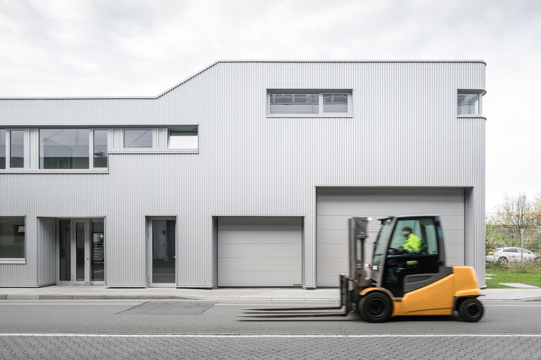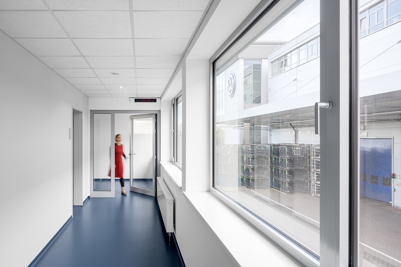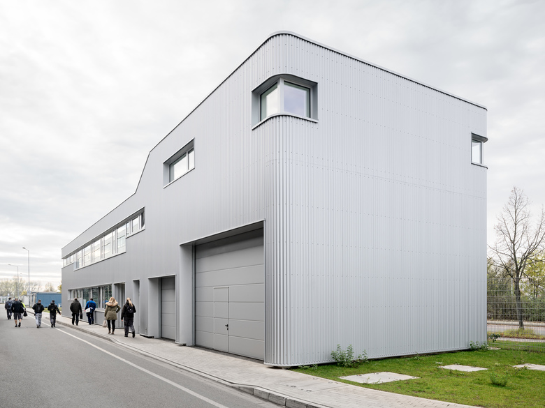 Der Entwurf für das Gebäude für Gesundheitswesen und Werkfeuerwehr nimmt mit der dynamischen Baukörper-Silhouette und der silbergrauen, metallischen Fassadengestaltung Motive aus dem Ensemble der Industriegebäude auf.